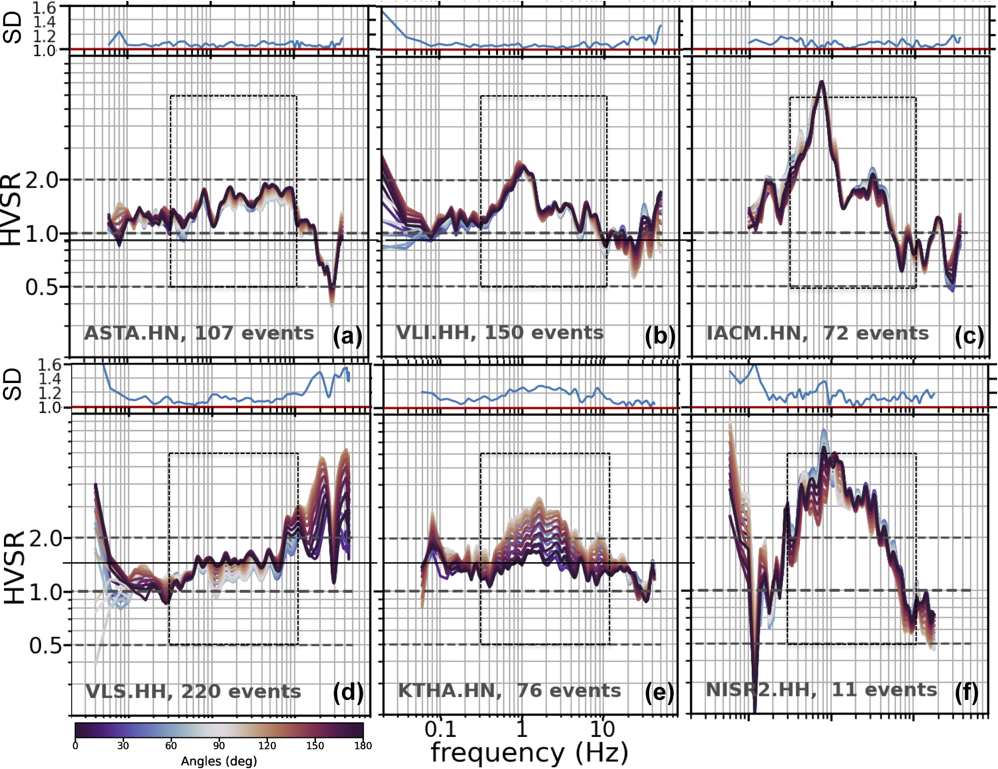 Figure B3HVSRs per component, as those are rotated by 10° intervals from north to east for all stations. Dashed horizontal lines indicate a factor of 2 from unity.