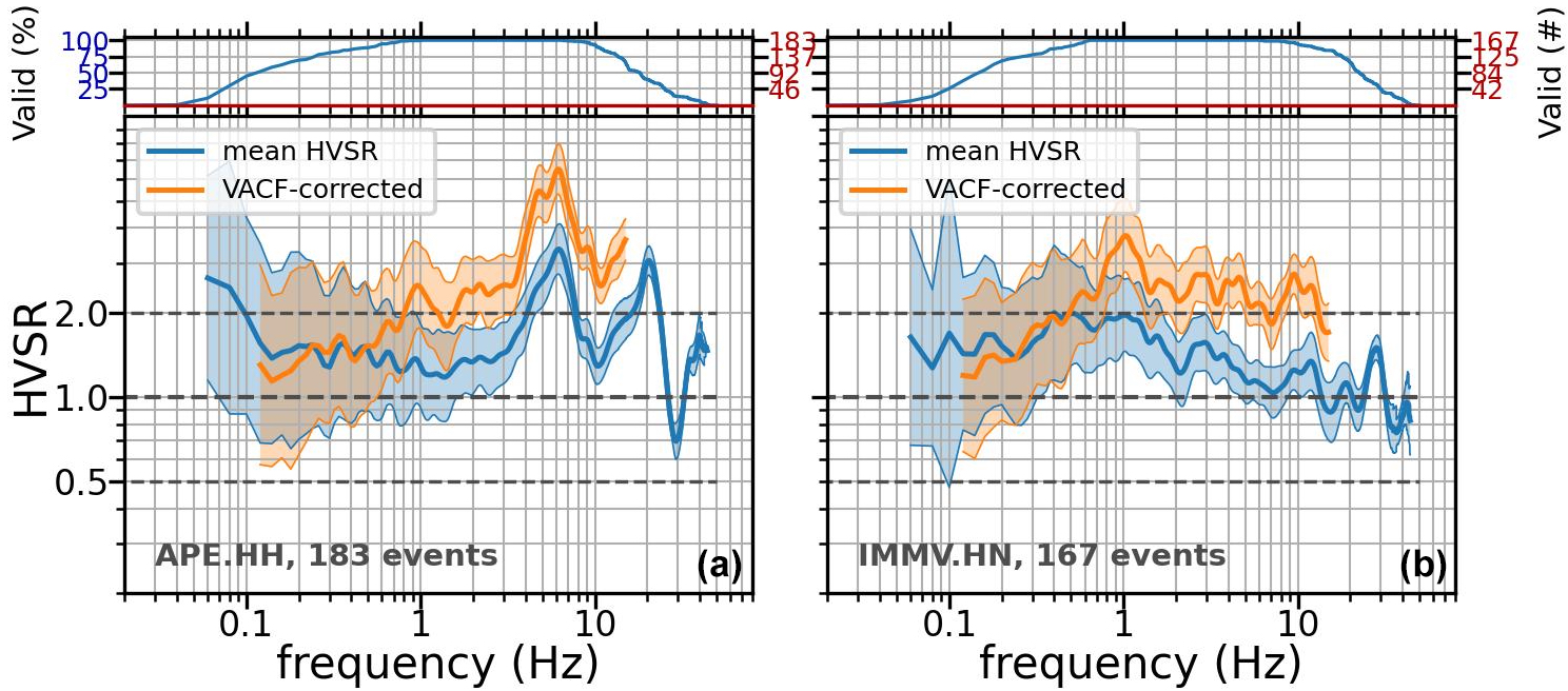 The HVSR is but a proxy for the actual amplification level (as given e.g. by the standard spectral ratio (SSR) of Borcherdt 1970), partly due to potential amplification of the vertical component used as reference. To investigate the extent of the potential underestimation in amplitude level, as an experiment we perform an additional calculation: we correct the HVSR for the implicit amplification of the vertical component. Because there is no model for Greece, we use the vertical amplification correction function (VACF) developed for Japan by Ito et al. (2020). The authors proposed this as a simple tool to estimate the horizontal S-wave amplification from the HVSR. It is based on diffuse field theory and their results from applying the generalised spectral inversion technique (GIT) to assess vertical site amplification from over 1600 strong-motion sites in Japan. Ito et al. (2020) proposed VACFs for various site classes based on HVSR shape, which are relatively constant in the frequency range of 1 to 15 Hz with an average amplitude of about 2. Applying this Japan-based method to Greek stations of course has its limitations, but in this experiment we consider that it may be a useful first approximation, as it comes from a region with a similar (active) tectonic regime. Considering that it is in any case a mere average over thousands of sites, individual site characteristics are already blurred. The VACF is proposed for 0.12–15 Hz, so we constrain our corrections to this range of applicability. An example comparison of HVSR and its VACF-corrected version is shown in Fig. 9 for the two stations shown previously in Fig. 4. For station APE (left), the 6 Hz resonant peak already identified by inspection of the mean HVSR becomes even more prominent after the VACF correction, with the amplification doubling from 3 to 6. On the other hand, at station IMMV (right), where HVSR did not exhibit enough amplification to identify significant peaks, a peak becomes visible at 1 Hz after VACF correction.