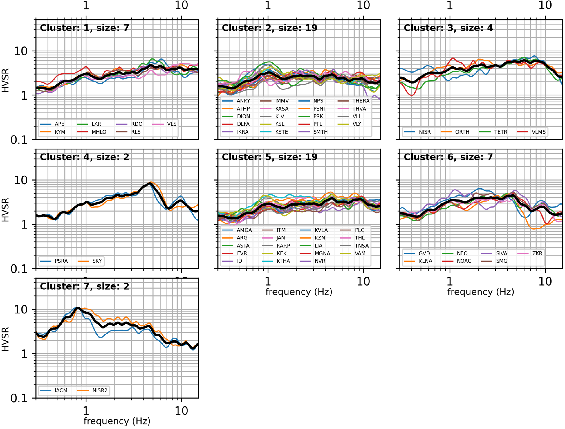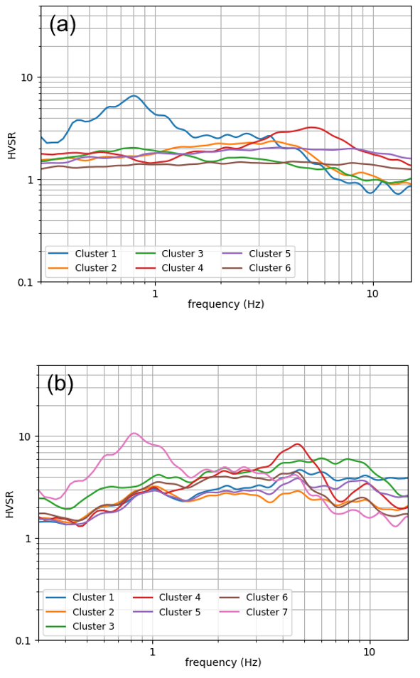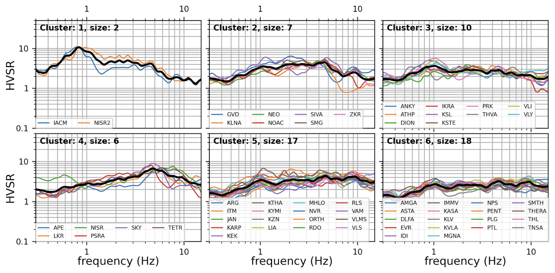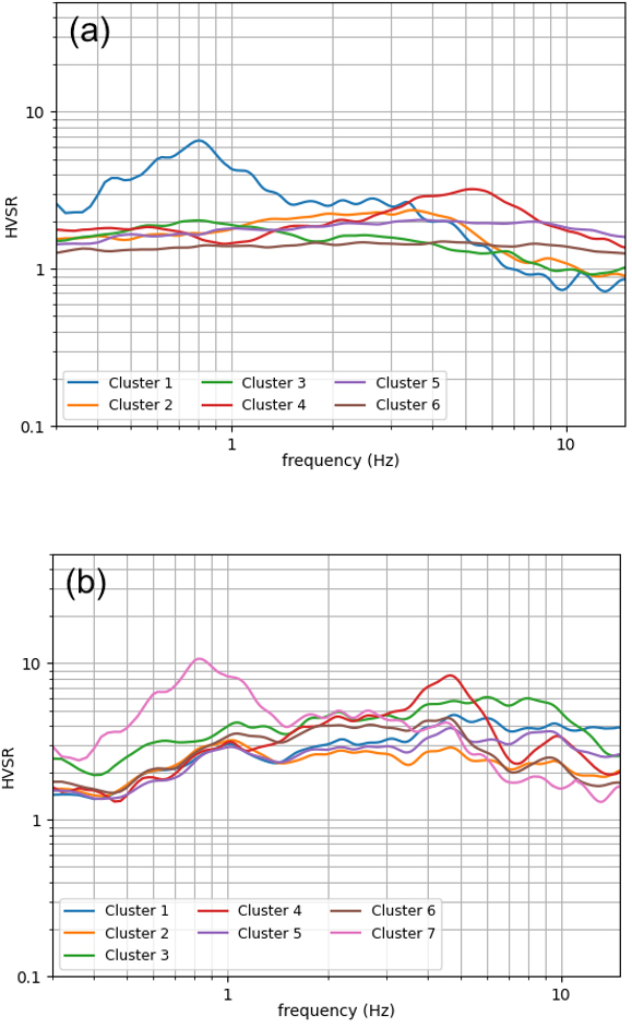 Figure 10 shows the six clusters derived from analysis of the HVSR curves. Cluster 1 shows clear low-frequency (LF) resonance for two sites, cluster 4 shows high-frequency (HF) amplification for six sites, and cluster 2 shows broadband amplification for seven sites. These three categories would not be considered to be reference sites. Cluster 6 includes 18 reference sites. Clusters 3 and 5 show low amplification with a downtrending and flat shape respectively, so they could likely be acceptable reference sites. The main classes identified by this analysis can be roughly distinguished as reference stations, LF/HF/broadband amplification that makes the response deviate from a reference site, and smaller amplification patterns that do not deviate strongly from the flat response. Other groupings could be reached by constraining the algorithm parameters, but our goal here is to call attention to a few patterns and how/if they deviate from the expected (flat) rock response. Finally, as an experiment, we repeat the clustering on the VACF-corrected HVSR, and the results are shown in Fig. B5 of the Appendix. Figure B6 of the Appendix compares the mean cluster shapes for the two cases. Table A1 of the Appendix includes the cluster number per station according to both groupings and a qualitative description.