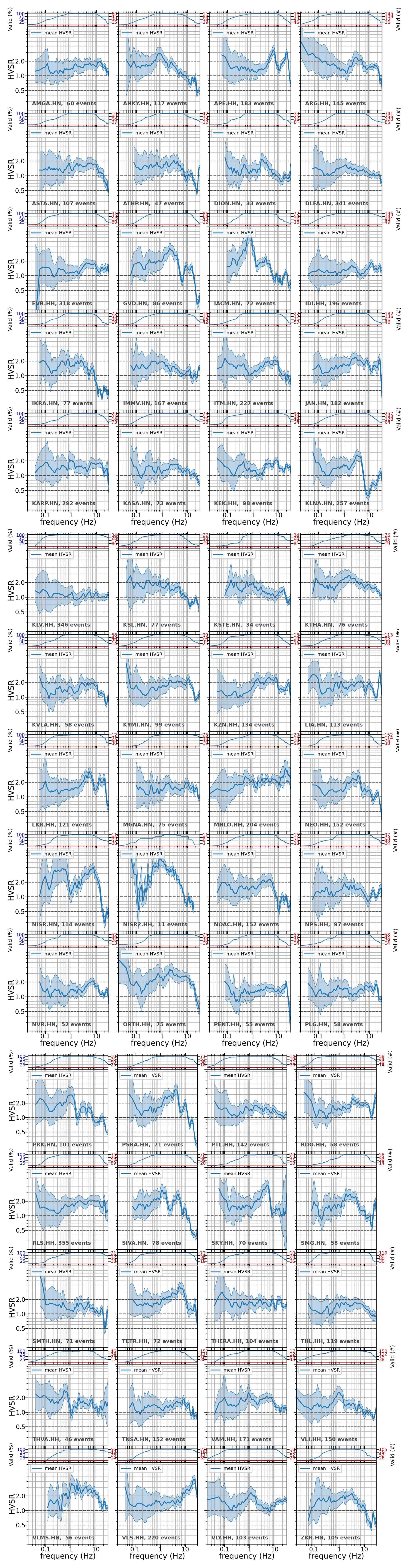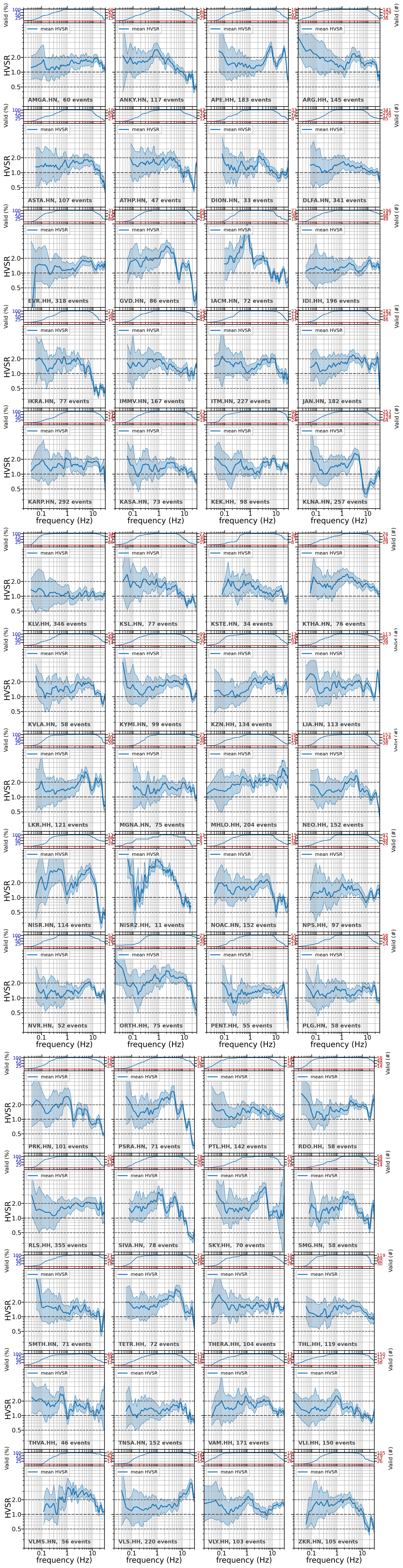 We compute the horizontal-to-vertical spectral ratio (HVSR; Lermo and Chávez-García, 1993) for each horizontal component of each recording at each station. We compute the spectral ratios in the same manner as the SNR: the start of the S-wave window is chosen so that the S waves are not affected by the tapering, and the acceleration FAS are computed and smoothed with a Konno and Ohmachi (1998) b=40. The mean HVSR per site is computed as the logarithmic average of all events, as is customary, and given that Ktenidou et al. (2011) showed that empirical spectral ratio ordinates are lognormally distributed. At each frequency, the mean is computed using recordings strictly within their legitimate bandwidth (from LUF to HUF), so the contributing number of earthquakes varies with frequency. Within the range of 1–10 Hz, typically all recordings are usable, while towards lower and higher frequencies, fewer recordings are strong enough to contribute. The FAS of the two horizontal components are combined for each recording as the square root of the sum of squares (SRSSs) to yield an orientation-independent estimate. Figure 4 (top) shows two examples of this rotation-invariant mean HVSR ± 1 SD. The inset on top indicates the number and percentage of usable recordings per frequency; e.g. for the APE station, 183 earthquakes contribute to the HVSR in the range of 0.9–9 Hz and less than 25 % (46 earthquakes) at frequencies below 0.07 Hz and above 25 Hz. The curves and their ± 1 SD uncertainty (shaded area around the mean) are only drawn for frequencies where the number of usable events is at least 5, to ensure a more robust estimate (many ground motion applications require 3). Figure B2 in the Appendix shows the rotation-invariant mean HVSR results for all of our 60 stations in alphabetical order. Figure 4 (bottom) is explained in the following section.