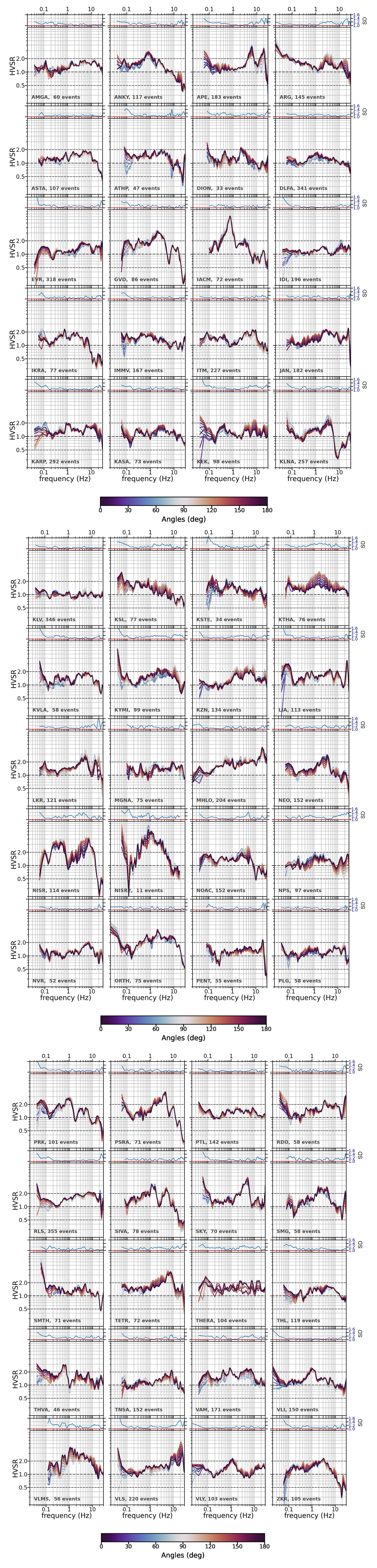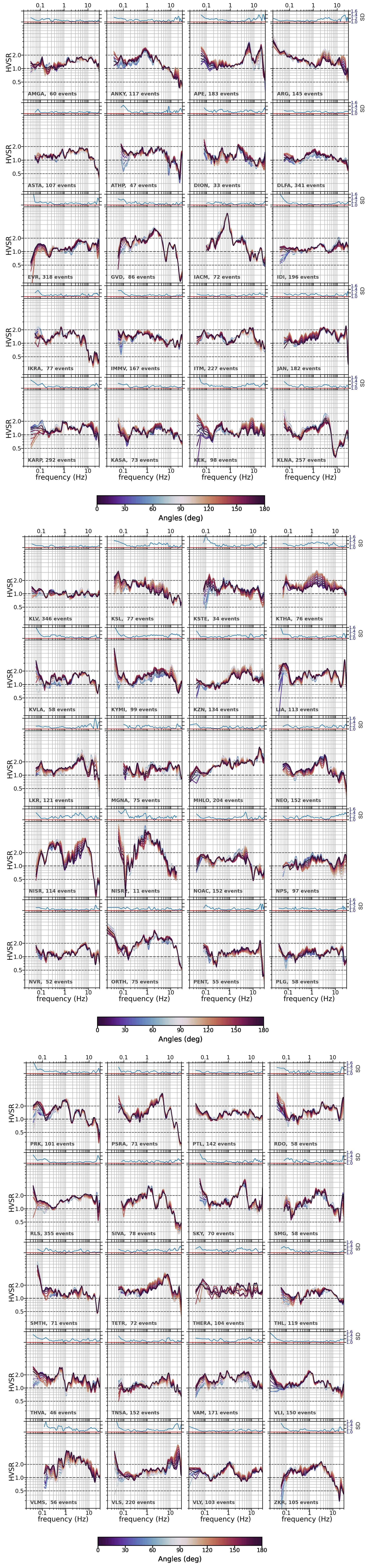 Figure 7 shows an example of how directionality is quantified. The mean HVSR is computed per component as it is rotated by 10° increments; e.g. the north component is rotated from 0–170° in order to sample all possible orientations. The inset on top indicates the standard deviation per frequency of HVSR values across all angles. We consider this standard deviation (SD) value to be an index of the directional variability of each station's site response. The typical parameters extracted from such calculations are the resonant frequency f0, the corresponding amplitude A0 – mostly as an indication – and the same metrics for the first higher mode, if applicable. In addition, we note the directional variability (SD) of the transfer function amplitude, and to this end we compute the mean of the SD function across two indicative frequency ranges of interest, namely a wide one spanning 2 orders of magnitude (0.3–30 Hz) and a narrow one perhaps more interesting for typical structural response (1–10 Hz). We also note the value of this function around the resonant frequency of the site. We propose that these three values (SD0.3−30, SD1−10, SDfo) can be used as approximate indicators of the azimuthal stability of site response. For site VLS used as an example in Fig. 7, the scatter in HVSR occurs above 10 Hz and thus affects mostly SD0.3−30 (1.24) and SDfo (1.48 at 20 Hz), while SD1−10 (1.12) is relatively low.