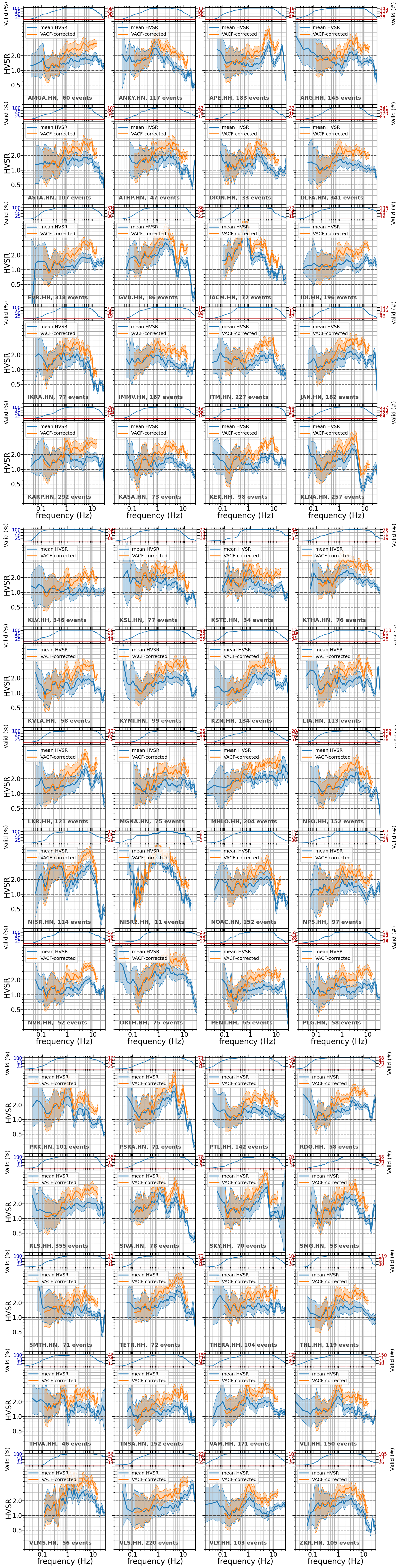 Table A1Detailed results of the HVSR analysis for the stations in this study. Bold characters indicate cases where a peak is identified in HVSR after VACF correction where there was none before.