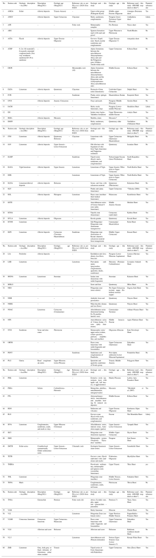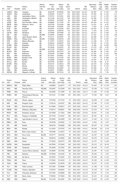 Table A5 compiles all the information gathered on surface geology at our rock stations. Information on the HN stations is available from https://accelnet.gein.noa.gr/station-information/ (last access: 31 December 2023). Descriptions of the geological unit and age are provided for HN stations by Margaris et al. (2021). Finally, 17 of our 60 stations were also found in the list of Pilz et al. (2020) for European reference sites, and in those cases we also report the unified geological descriptors attributed to them according to the European Geological Data Infrastructure (EGDI). Two of those attributes were based on AI and are noted as such in the table.