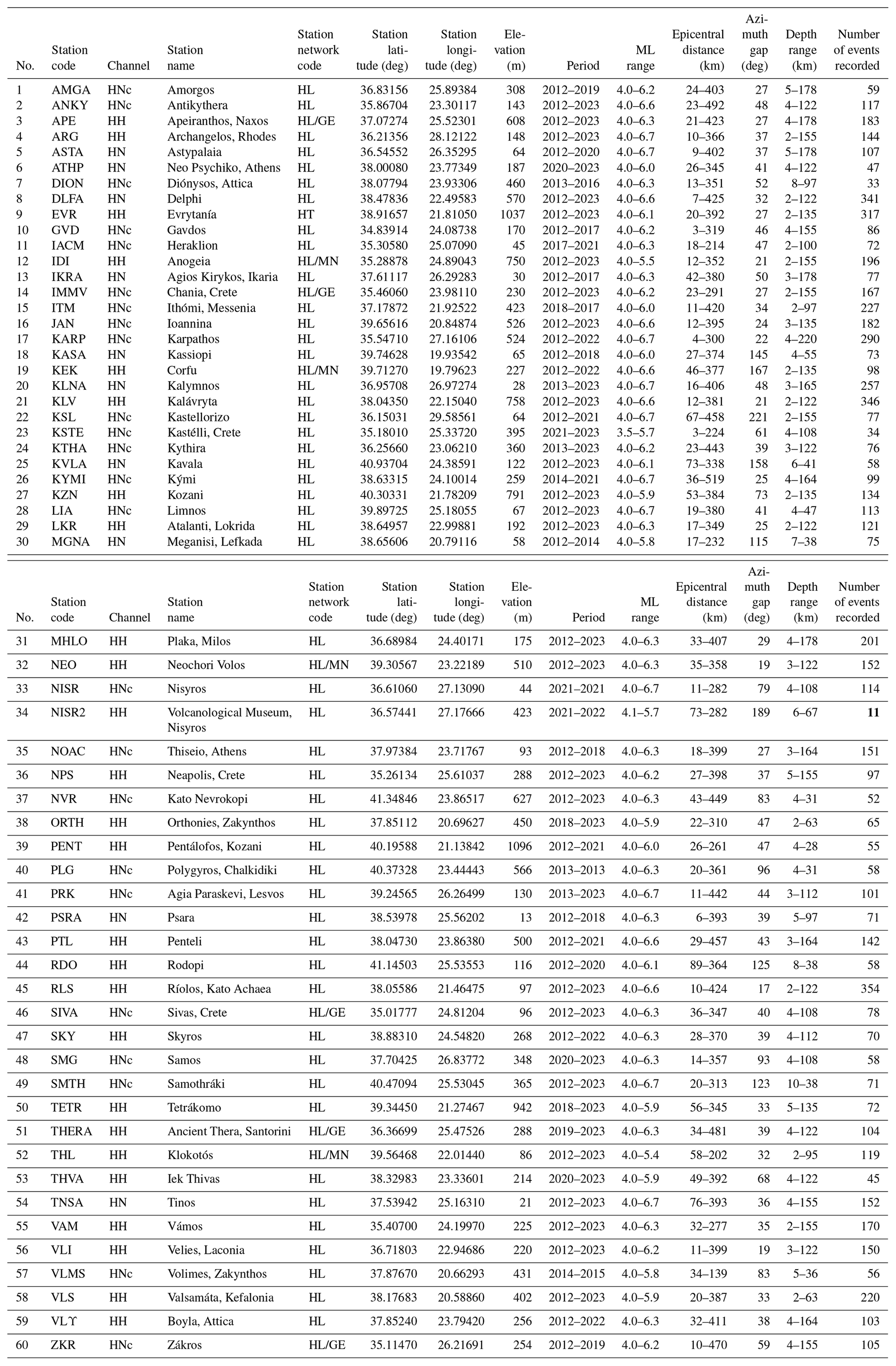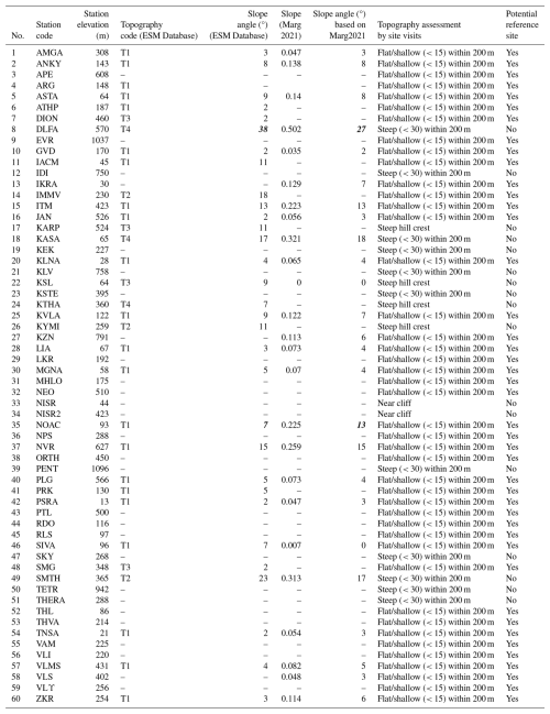 Table A3 compiles the information gathered on terrain slope and topographic conditions at our stations from various sources. For the HN stations, the ESM Database (https://esm-db.eu/, last access: 31 December 2023; Lanzano et al., 2021; Luzi et al., 2016) provides the slopes in degrees along with their classification into four categories with the following codes: T1 slopes are “Flat surface, isolated slopes and cliffs with average slope angle i≤15°”; T2 slopes are “Slopes with average slope angle i>15°”; T3 slopes are “Ridges with crest width significantly less than the base width and average slope angle 15° ≤ i≤30°”; and T4 slopes are “Ridges with crest width significantly less than the base width and average slope angle i>30°”. For the HN stations again, Margaris et al. (2021) provide an estimate of slopes, which we have also converted into degrees and which for the most part almost coincides with the angles by the ESM Database (save two stations marked in the table in bold italics, DLFA and NOAC, where however the difference does not cause a change in the ESM Database code). This geomorphological information from external sources has the advantage of being homogeneous across a larger scale. However, we believe that on a site-specific basis, the most reliable and precise information comes from the operator's site visits. Thus, additional detail is provided in Table A3 based on site visits at all our stations. We group stations into the following categories: (1) flat/shallow (< 15) within 200 m, (2) steep (< 30) within 200 m, (3) steep hill crest, and (4) near a cliff. This offers new information for 35 stations for which no information was available before, some of which pertains to various kinds of steep conditions.