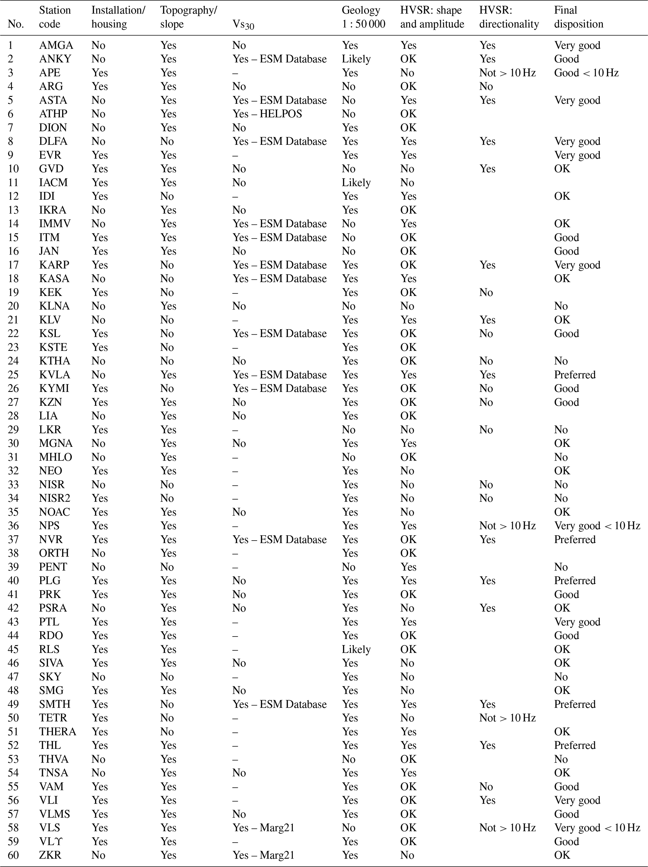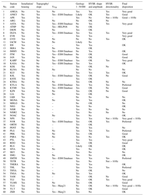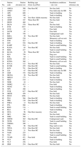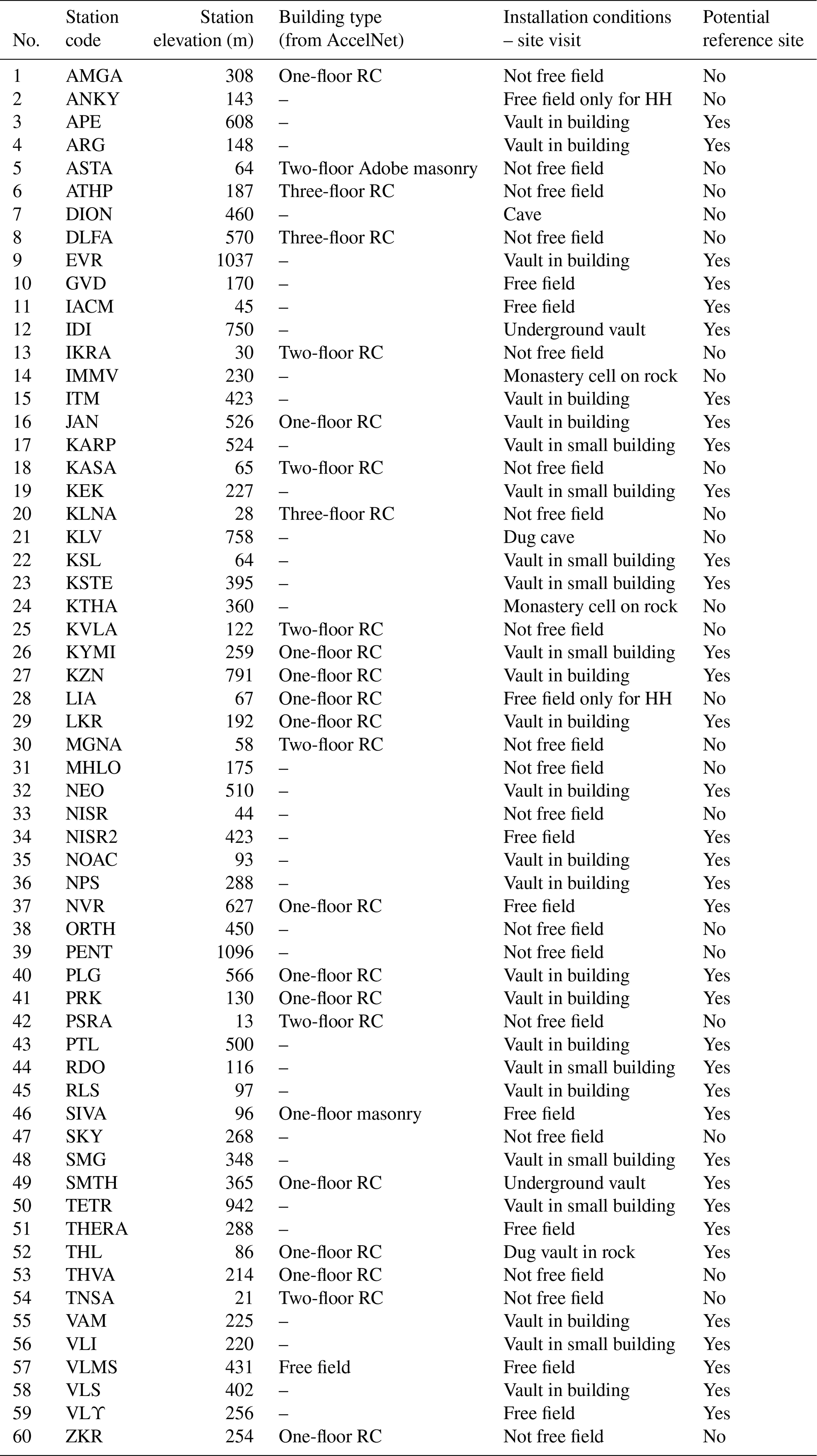 Since the early observations of Cranswick et al. (1985), installation conditions have been known to affect seismic recordings, especially at high frequencies, and this discussion has recently been revived (Hollender et al., 2020; Castellaro et al., 2022). Table A2 of the Appendix compiles the information on housing and installation conditions at our 60 rock stations. Information on the HN stations is available from https://accelnet.gein.noa.gr/station-information/ (last access: 1 April 2025), while additional details, especially for the HH stations, are provided by the operator based on site visits, with more detailed descriptions given in the dedicated article on EIDA@NOA (Evangelidis et al., 2021). The last column of the table provides our assessment of each station as a reference station based on installation conditions. Housing conditions for the HL network are different to those of other countries, with explicit free-field conditions being rather rare. The Italian equivalent (Lanzano et al., 2020) only makes reference to two types of stations, free-field and in-power towers, while the NOA network has had to make use of environments as diverse as monastery cells. However, in all cases where a “vault” is mentioned, this is created within the host structure by cutting around the station in such a way so as to isolate its potential motion from that of the surrounding structure, avoiding soil–structure interaction effects.
