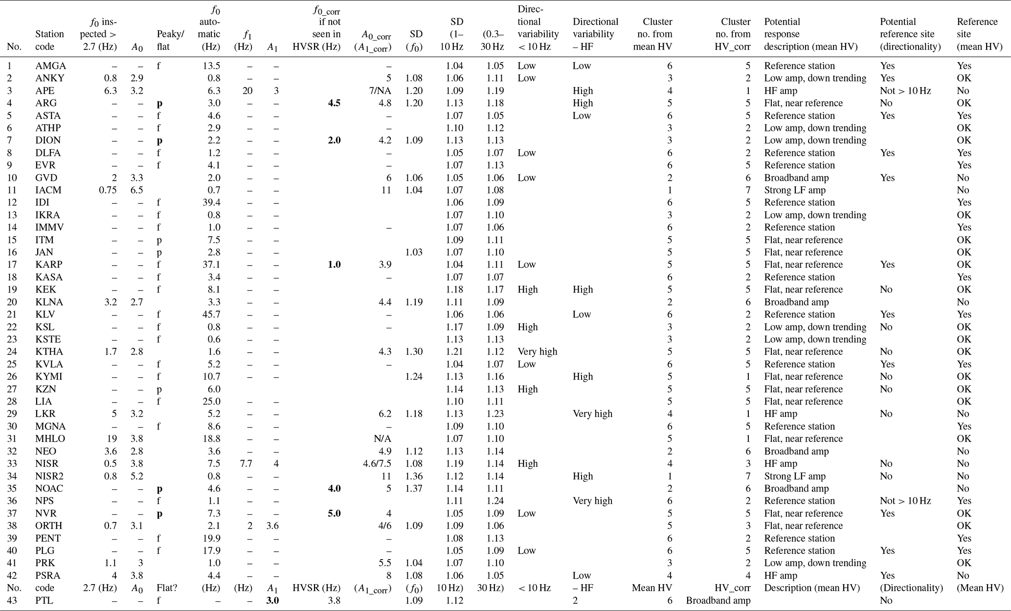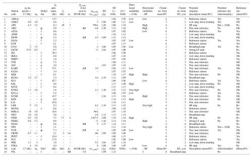 Table A1 of the Appendix compiles all the data-derived results estimated in this section, such as f0, A0, f1, A1 (if applicable), f0_corr, A0_corr, SD0.3−30, SD1−10, SDfo, directionality qualifiers, cluster numbers, and a description of the amplification pattern. Table A1, along with all tables, is available in xls format as supplementary material (assets). It is outside the scope of this paper to compare HVSR for HH and HN channels at collocated stations. This was done preliminarily and helped identify a small number of component or metadata issues, which have since been corrected. We choose to show results from the HN sensors (HNc in Table 1) because they have the benefit of not clipping and hence allow for a richer dataset.