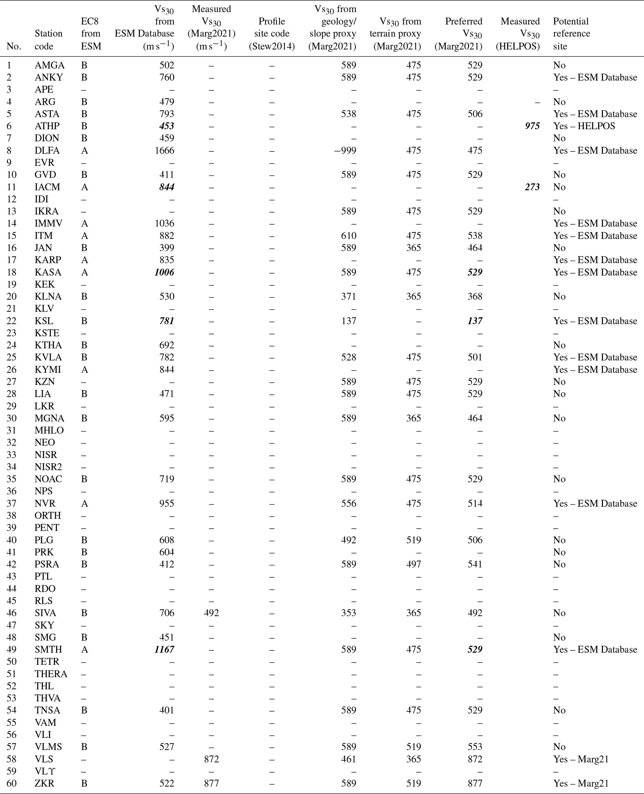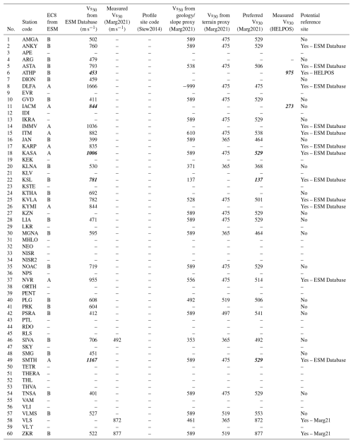 Table A4Vs30 estimates for the stations in this study. The strongest contradictions between sources leading to a jump in site class are marked in bold italics.