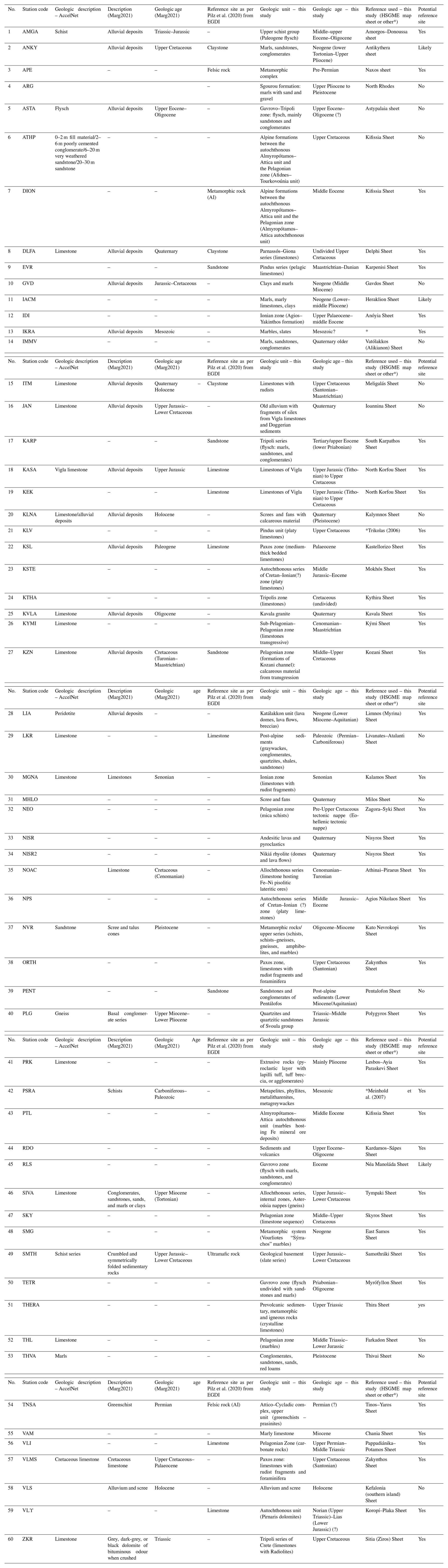 One important feature of this study is that we provide new information for all stations, including a description of the geological unit and age. This is based on the combination of site visits with the detailed revisiting of maps and the literature. The majority of stations was located in 53 geological maps (1:50 000 scale) published by the Hellenic Survey of Geology and Mineral Exploration (HSGME), and their geology was interpreted in conjunction with knowledge of the local features from site visits. Geological conditions for a couple of stations were derived from relevant publications indicated in Table A5 with an asterisk. There are several contradictions between the various sources, too numerous to discuss in detail here. Our best estimate after assessing all available information and experience is given in the relevant columns (“this study”).