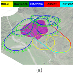 Lastly, the active view planning approach plans maneuvers in a receding horizon manner. This is in contrast to the approach used for the safe navigation planner, as the terminal maneuver is evaluated for safety. As the horizon of the active mapping is relatively large (30 s), the probability of the vehicle heading into a dead end is low. Therefore, the maneuver generated by in the Mapping state is not guaranteed to be safe. Additionally, if the terminal state of the receding horizon path is constrained to stay within the terminal safe set (such as the valid loiter region), then the plan becomes too conservative and will not be able to enter steep terrain. Future work should address the problem of ensuring safety without the active mapping planner become too conservative.