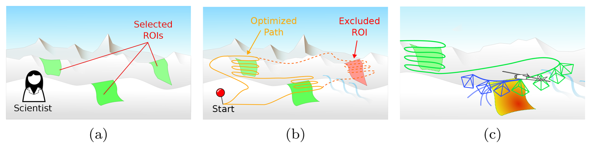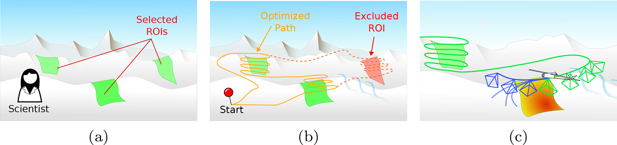 Figure 1Overview of the autonomous avalanche monitoring using a long-range fixed-wing UAV. (a) Scientific domain expert defines multiple ROIs which can be avalanche release areas. (b) A subset of reachable ROI would be selected for a single sortie and passed to the small uncrewed aerial system (sUAS) (c) Once reaching the ROI, the vehicle will gather image data for use of photogrammetry where the release volume, avalanche outline and texture of the snow can be acquired.