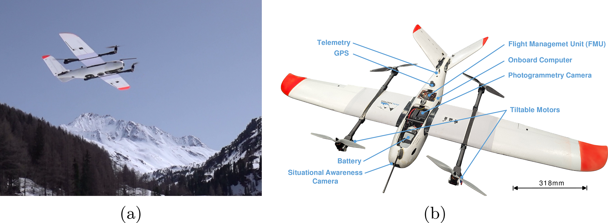 Figure 2(a) Image of the tiltrotor VTOL platform taking off during the field deployment in a narrow valley in Davos, Switzerland. (b) Overview of airframe and components of the system.