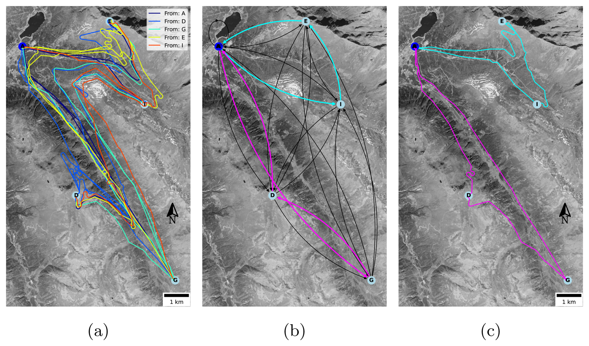 Figure 3Visualization of the route optimization example with four ROIs. The start position is labeled as A, and the ROIs are labeled as D, G, E, I. (a) Roadmap of the full graph. Each edge is a safe path navigating from one vertex to the other. The edges are colored based on which vertex the edge is started from. (b) Graph and solution of the orienteering problem. The edge cost of the graph is the path length of the paths shown in the roadmap. The solution route of the orienteering problem is highlighted in cyan for the first flight, and magenta for the second flight. (c) Path of the solution path. Source of orthoimage: swisstopo (1998b).