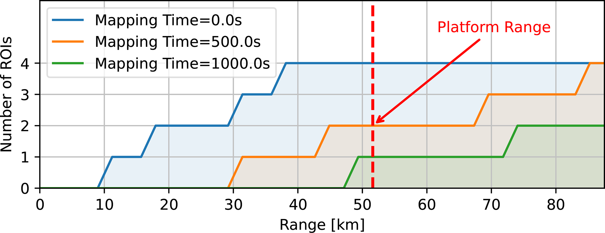 Figure 4Number of ROIs reachable with different ranges of the vehicle, for the ROIs shown in Fig. 3a. Low mapping time allows the vehicle to reach more ROIs. The range of the platform (51.6 km) is marked as the red dotted line.