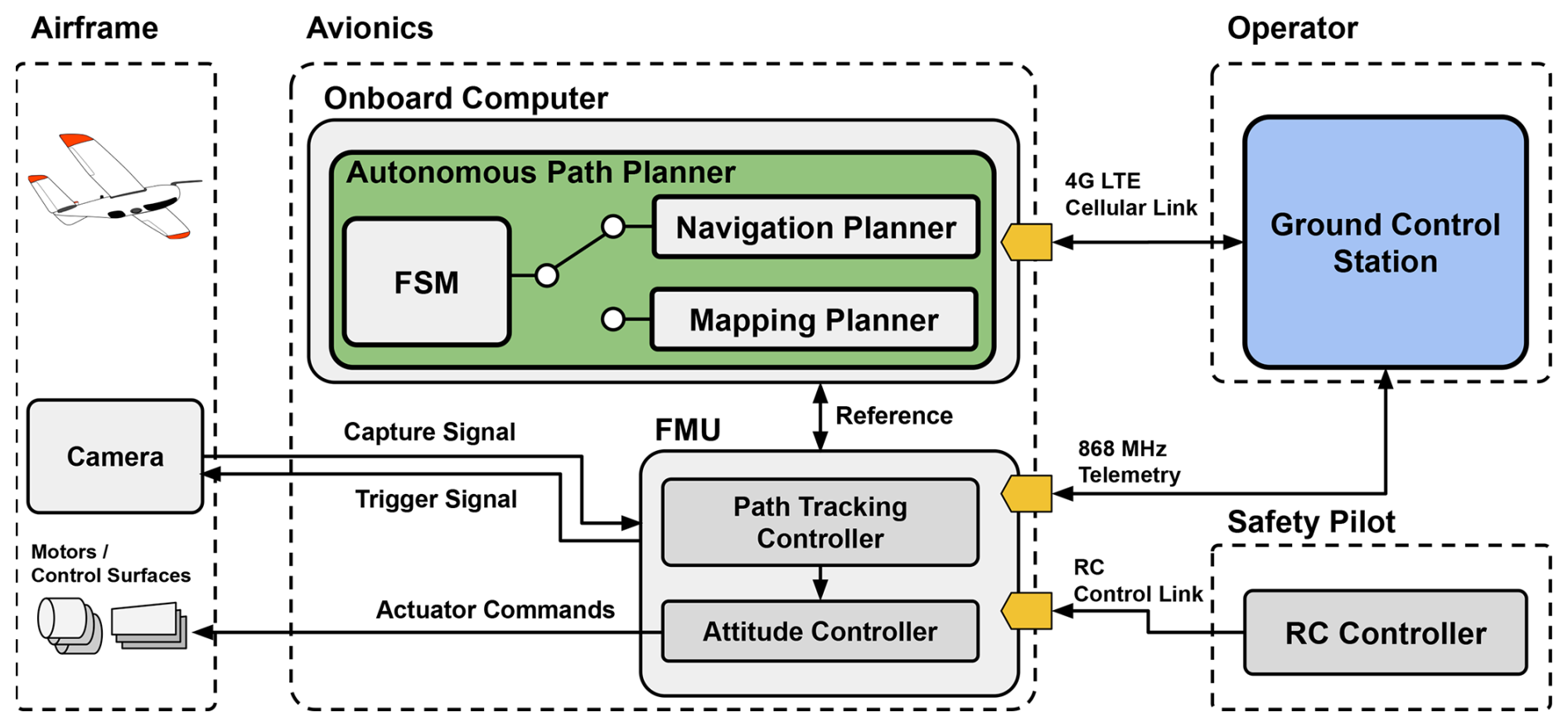 The avionics of the system consist of a flight management unit (FMU) and an onboard computer. Our system uses the Holybro Pixhawk 4 FMU running the PX4 autopilot software (Meier et al., 2015). The FMU runs low-level control loops, such as the guidance controller used for path following (Stastny and Siegwart, 2019), which stabilize the vehicle and is capable of global navigation satellite system (GNSS)-based navigation. GNSS-based navigation provides safety in case the onboard computer fails or the communication to the operator or safety pilot is lost. The onboard computer is an Intel NUC, equipped with a 3.5 GHz Intel Core i7-7567U CPU. When engaged, the computer runs the autonomous path planner, sending commands to the FMU.