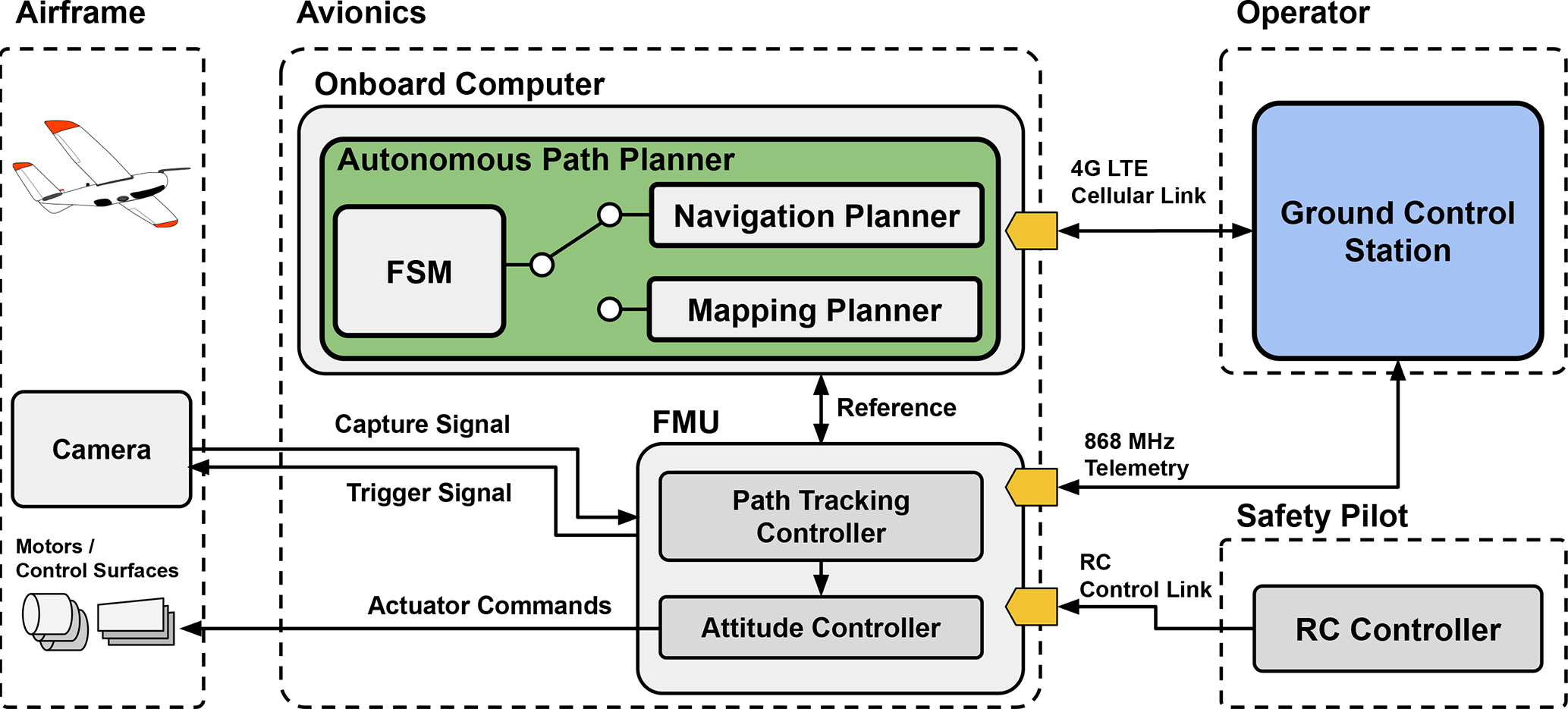 The vehicle is operated through an operator using two independent communication links. A cellular connection to the onboard computer is used for command and visualization of the autonomous planner, as well as telemetry data directly from the FMU. A redundant 868 MHz telemetry connection is used to stream data directly from the FMU. An RC uplink enables a safety pilot to fly the vehicle manually in the case of an emergency.