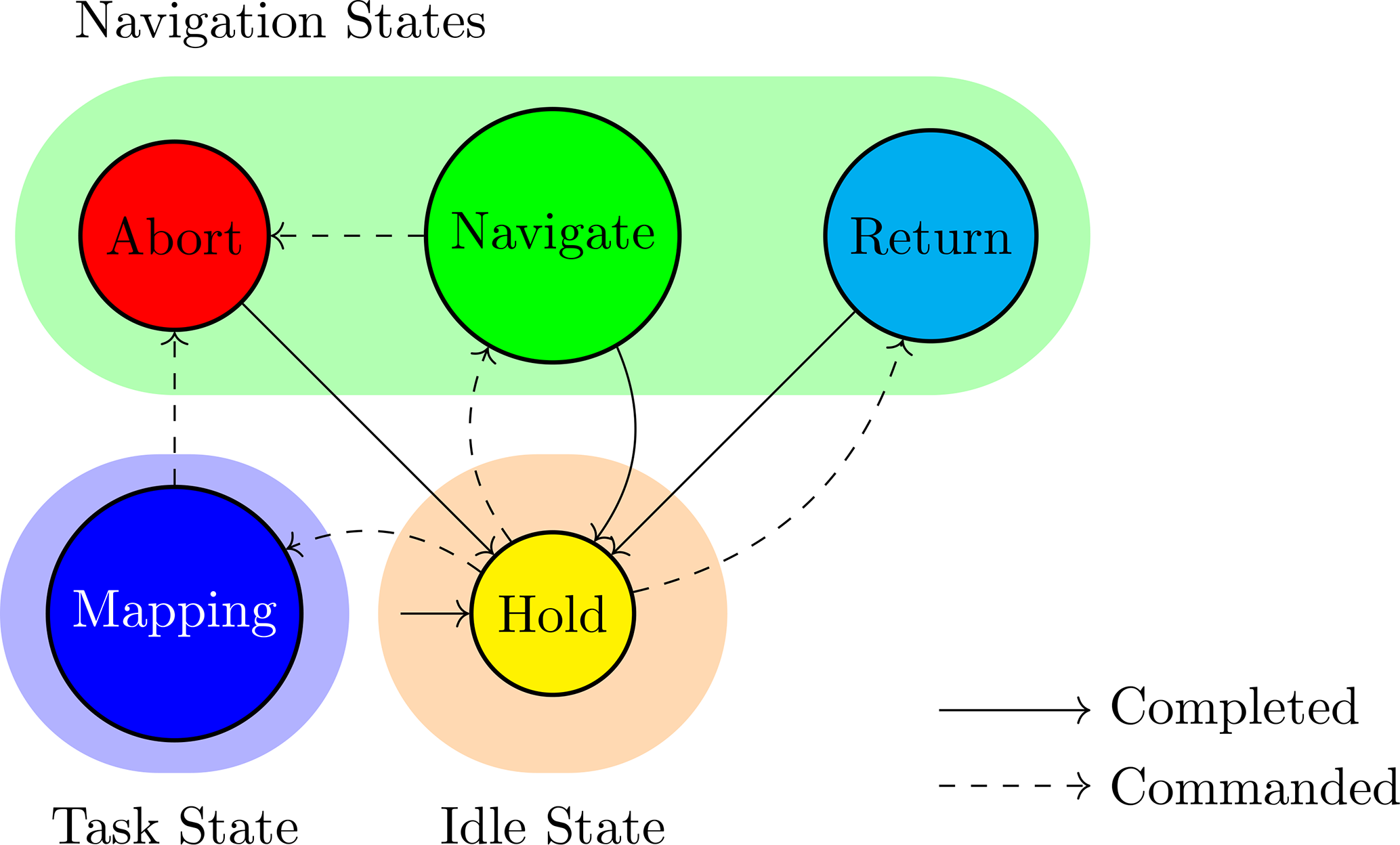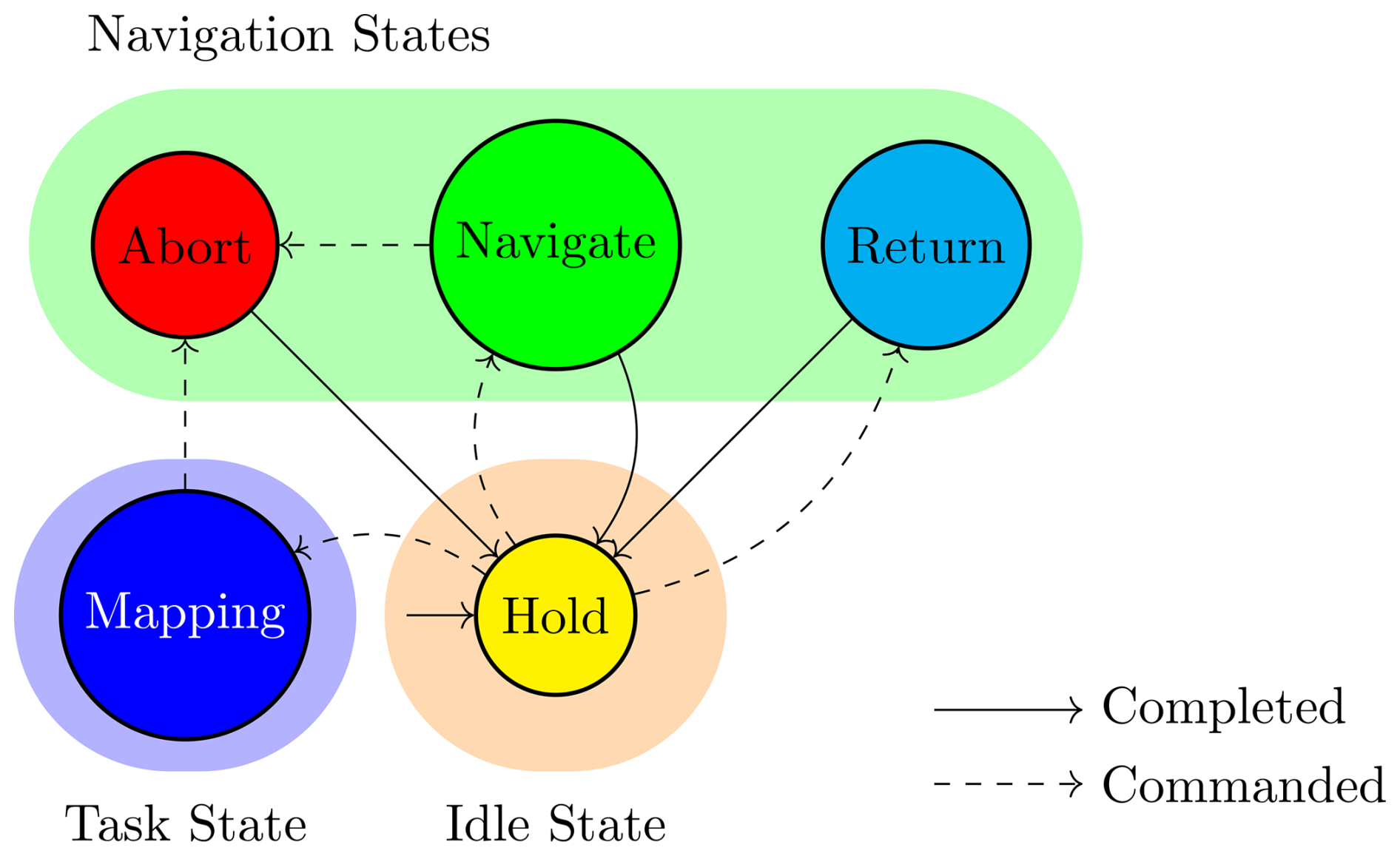 There are five discrete states, denoted Hold, Navigate, Mapping, Abort, and Return. These states correspond to the respective tasks, which we group into an idle state, a navigation state, and a task state. An idle state includes the Hold state, where the vehicle stays on a circular periodic path. The vehicle can indefinitely wait for the next operator command, and therefore it is assumed that the vehicle always start from a Hold state. Navigation states include Navigate, Abort, Return, where the goal is to guide the vehicle safely to a target position from the current position. The task state includes the Mapping state, as this is the only task that the vehicle needs to do for data gathering. During Mapping state, the vehicle actively maneuvers to find the most informative set of viewpoints for photogrammetric reconstruction.