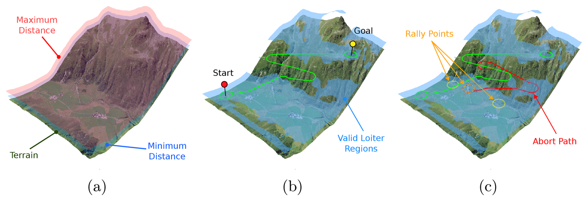 Lastly, the Abort state is used for aborting a currently executed path. To identify a safe place to abort the current executed path, multiple positions within a specified radius are sampled. If a sampled position is in the valid loiter region, then it is considered as a rally point, where the vehicle can abort the mission safely. In this work, we search the terrain within a given radius until N valid rally points are discovered. If a valid path is found to one of these rally points, that path is executed. In this work, we found N=3 to be sufficient for finding a valid rally point (Fig. 7c).