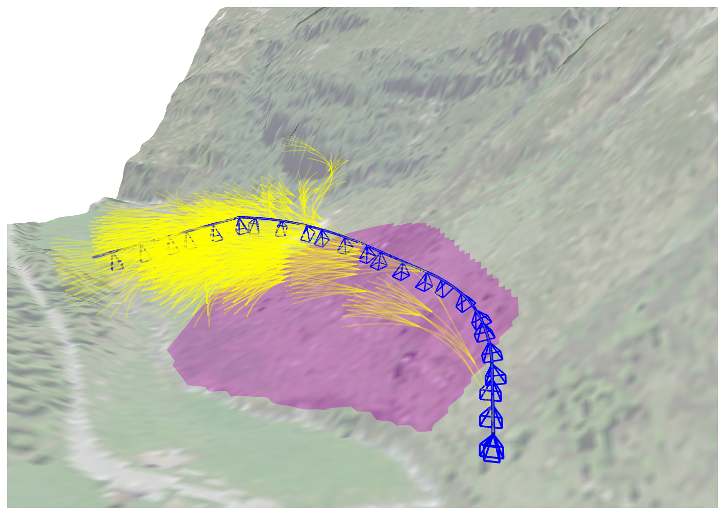 Figure 8Visualization of the active planner mapping an ROI marked as a magenta overlay. The motion tree generated by monte-carlo tree search (MCTS) is highlighted in yellow. The best maneuver is highlighted as, with the expected viewpoints visualized as view frustums. Source of DEM: swisstopo (1998a). Source of orthoimage: swisstopo (1998b).