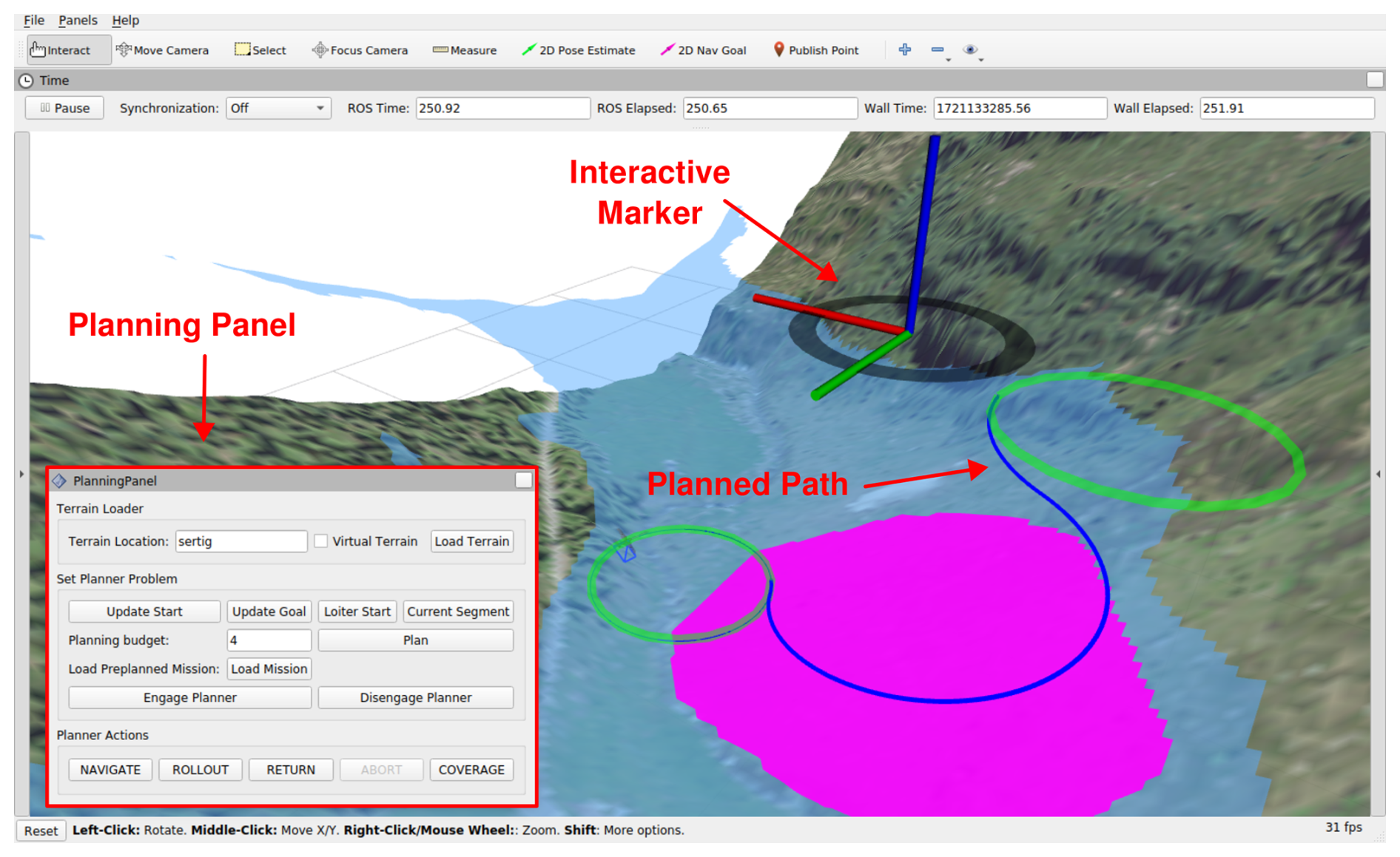 The interactive marker serves as a cursor, where the operator can dynamically choose the target position on where the vehicle should navigate. For example, if the vehicle is in the Hold state, the operator can define the goal position through the interactive marker. When the operator switches to the Navigate state, the autonomous planner finds the shortest path from the current loiter to the target loiter path and the vehicle follows it.