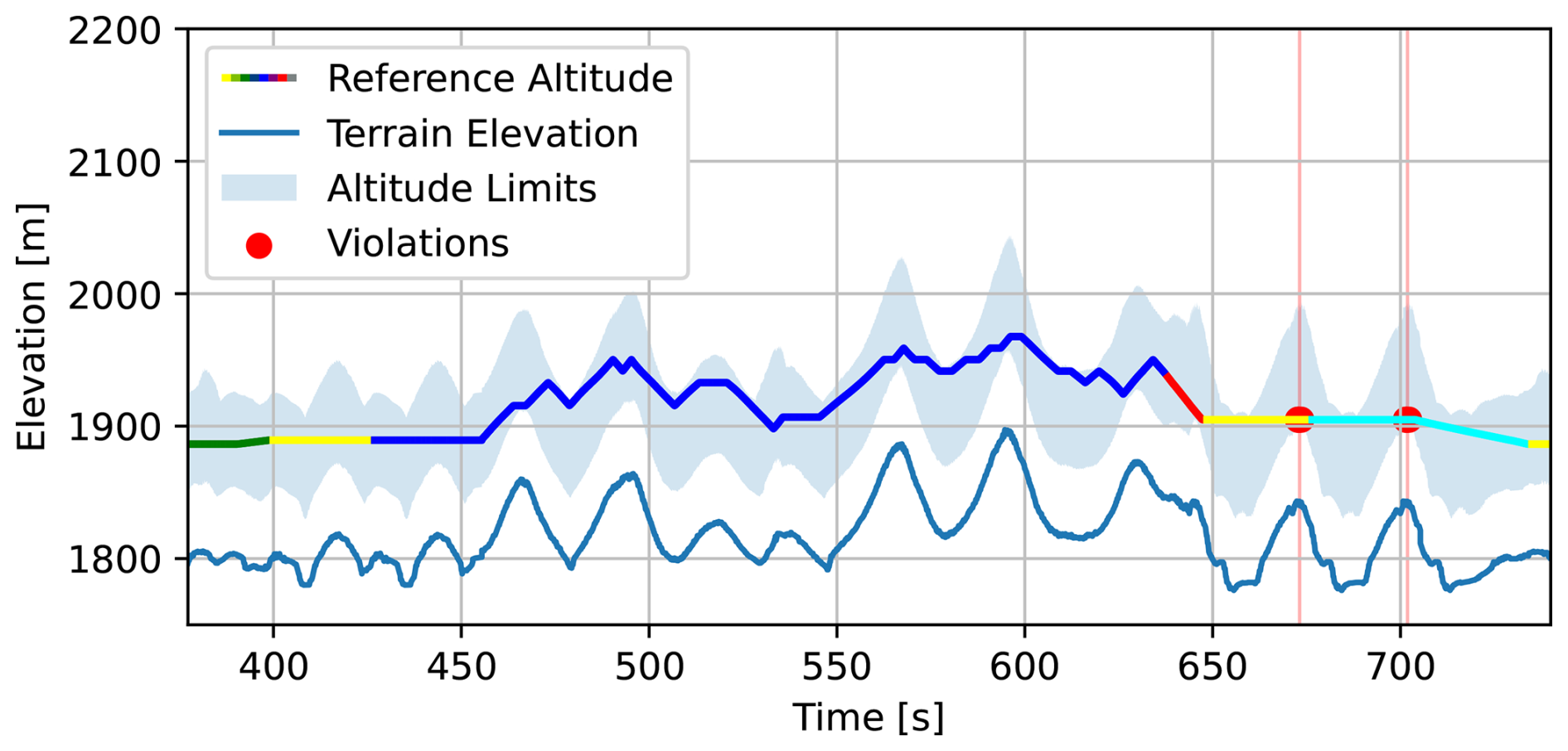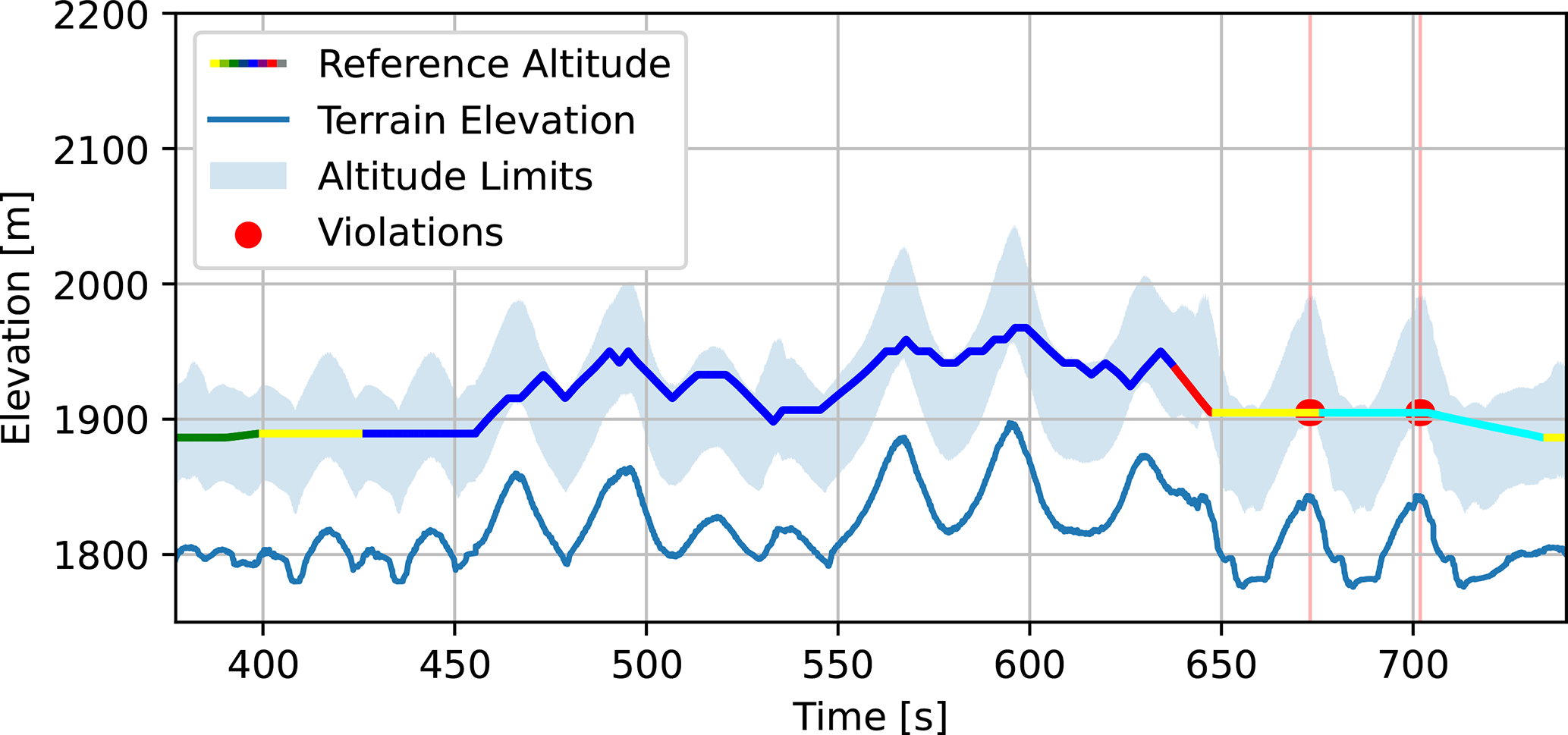 Figure 12Altitude of the reference position, colored with the flight mode. The terrain altitude below the reference position is plotted in solid blue. The flyable space that satisfies distance-to-terrain constraints is visualized as a blue overlay. Violations of the reference is visualized as red.