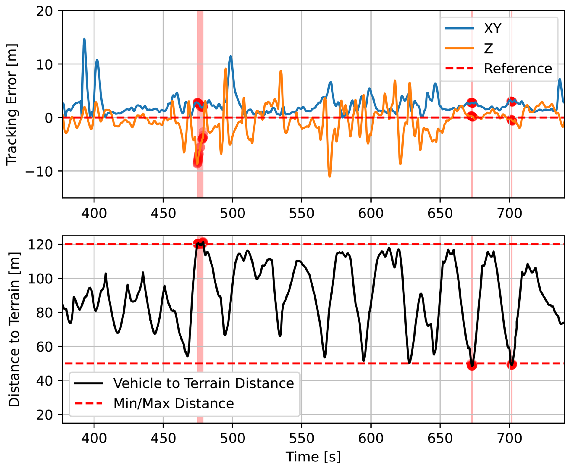 Figure 13(Top) Tracking error in X, Y, Z for the vehicle to the planned reference. The large tracking errors come from the discontinuous changes in curvature and flight path angle of the reference path. Violations of constraints are marked as red circles. (Bottom) Vehicle Distance to Terrain. The vehicle briefly violated the altitude constraints three times during the flight test (each < 1 s).