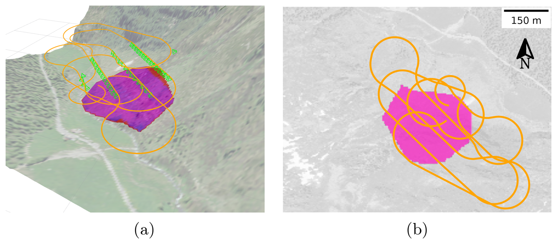 We validate the system in a real-world field test, where the vehicle is deployed in alpine terrain to map an avalanche deposit in Davos, Switzerland (Fig. 10). We demonstrate a case where the vehicle is trying to map a single ROI when the vehicle has arrived at one of the loiter points. While this experiment does not include the route optimization and mapping of multiple ROI, the crucial functionalities such as safe navigation and path following are demonstrated through the single ROI mapping experiment.