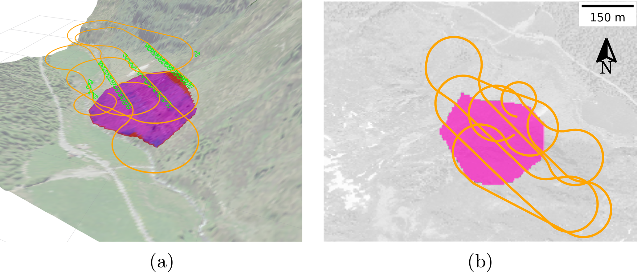 Figure 11(a) 3D visualization of active mapping path and viewpoints acquired during field tests visualized with the interface from the autonomous planner. The reference throughout the mission is color-coded for each of the states. The viewpoints acquired during the mapping state are visualized as green view fustrums. The magenta region shows the region of interest. (b) 2D visualization of active mapping path and projected on the map. Orange circles marks a violation of the distance constraints. Source of DEM: swisstopo (1998a). Source of orthoimage: swisstopo (1998b).