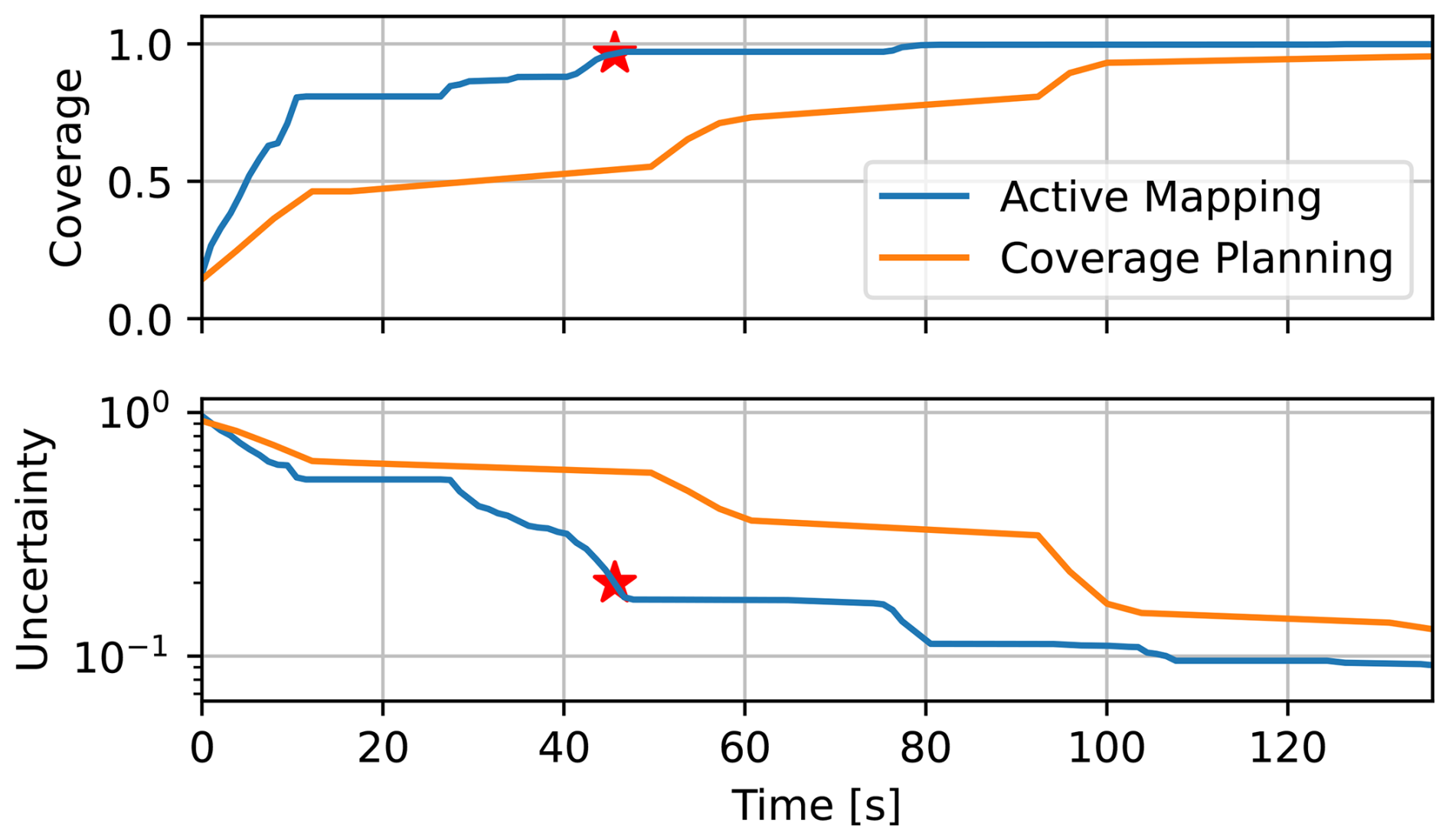 Figure 15(Top) Coverage comparison of active mapping and coverage mapping. (Bottom) Expected uncertainty comparison with active mapping and coverage mapping. The point in time with 67 images taken is marked with a red star (★).