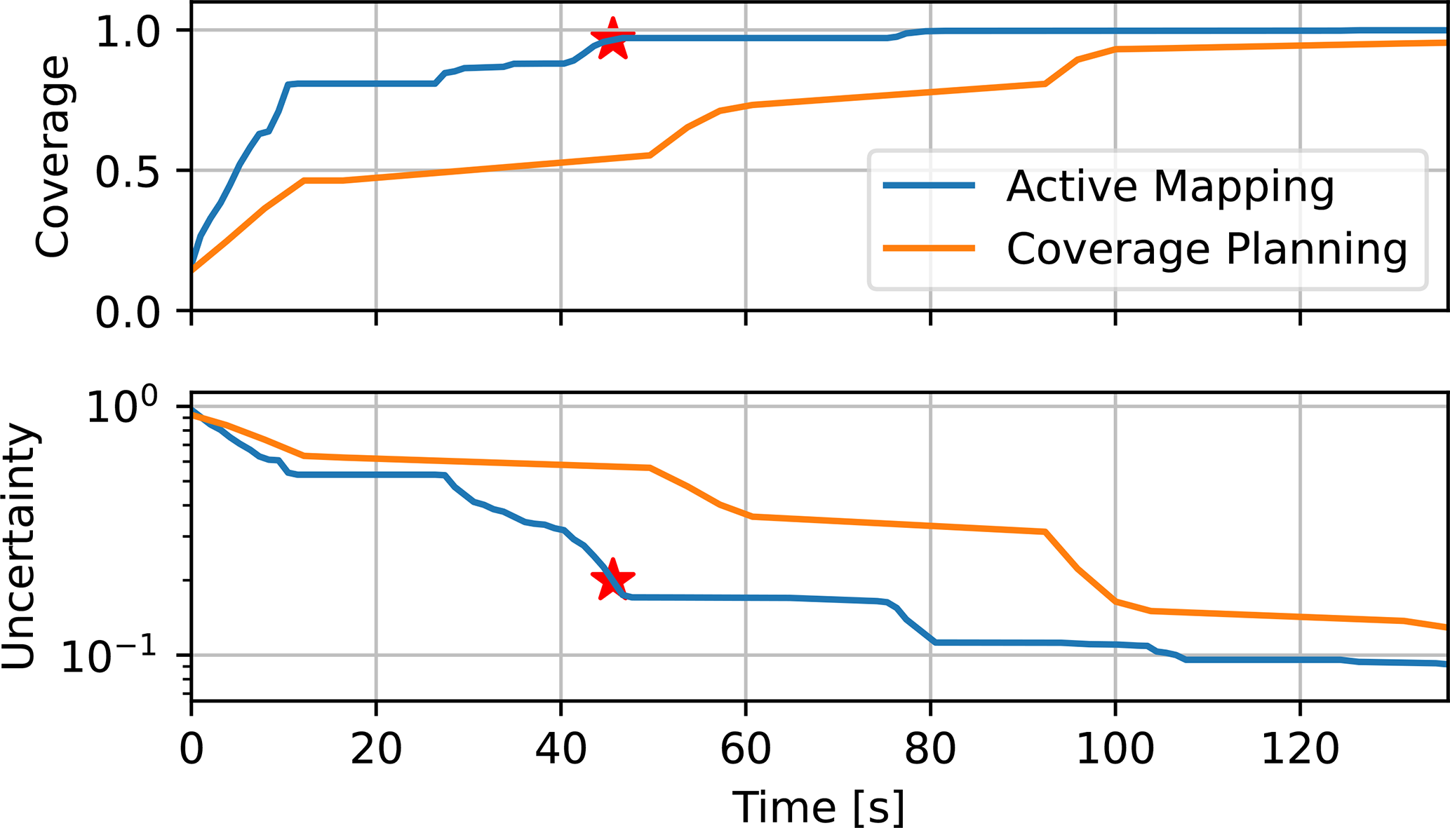 The expected uncertainty decreases significantly faster for the active mapping method than for coverage planning. The final uncertainty which the coverage planning took 135.73 s to achieve, took active mapping 79.42 s, which the time is reduced by 58 % by using the active mapping approach. Additionally, the final expected uncertainty at the end of the mission is also 57 % lower for the active mapping method (0.074 vs 0.129; Fig. 15). This is because the maneuvers selected by the active mapping planner are optimized to reduce the uncertainty, in contrast to coverage planning, which simply follows a path to geometrically achieve coverage. Therefore, coverage planning does not achieve full coverage until all the sweep patterns are flown. Additionally, the active mapping planner can continue to acquire viewpoints which reduce uncertainty even after the scene has been fully covered. Another reason for the coverage planner being slow is because of the images are only acquired during the straight sweeps and not during the turns between them. This results in steps, where during turns the improvement of coverage and uncertainty is stalled.