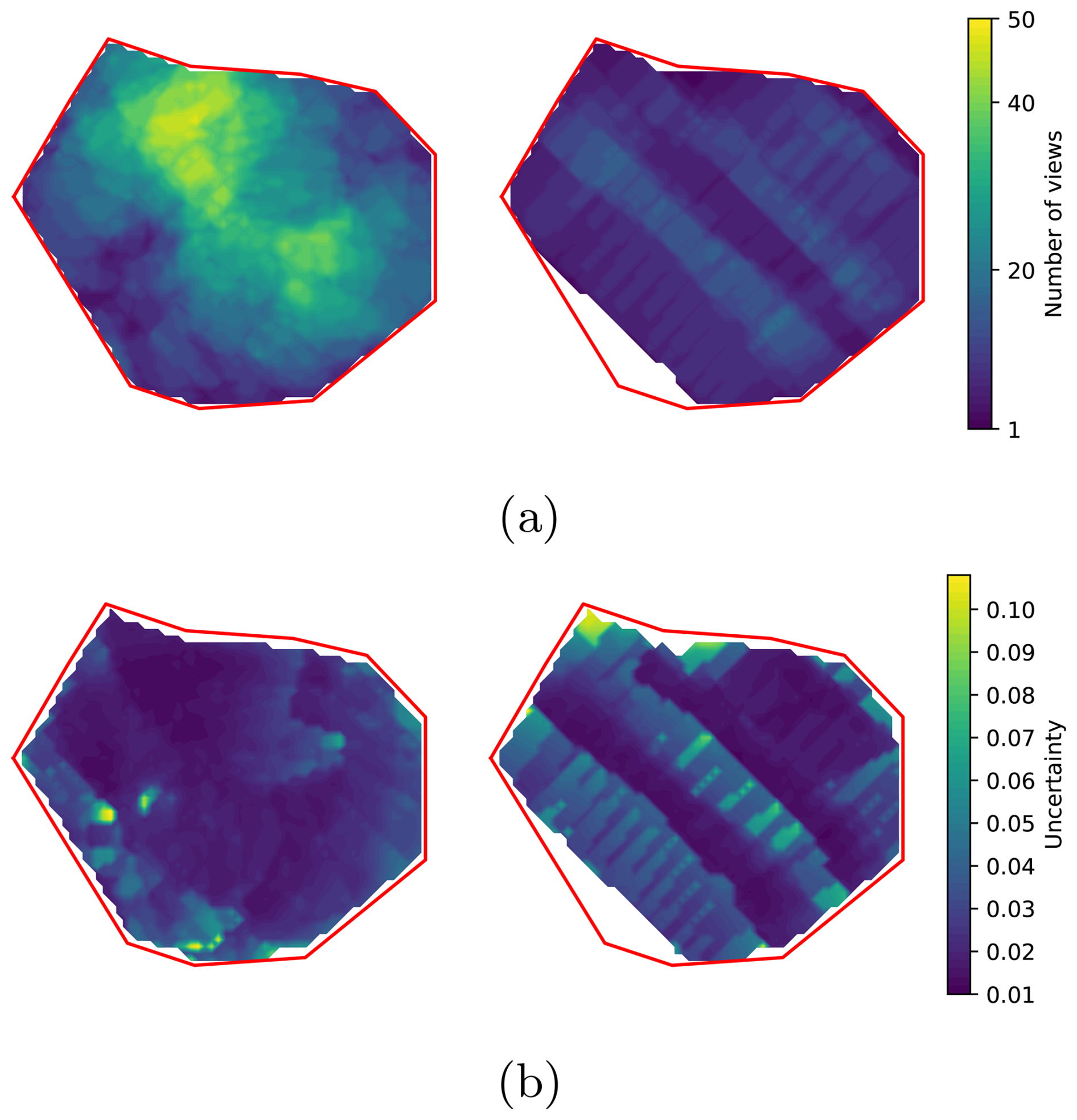 Figure 16Comparison of the (a) number of views, number of overlapping views, and (b) expected uncertainty and expected uncertainty between active mapping and coverage mapping after flight test (Left: Active Mapping, Right: Coverage Mapping). The ROI outline is marked as a red line. Regions with no color inside the ROI are regions on the surface that have zero views visible.