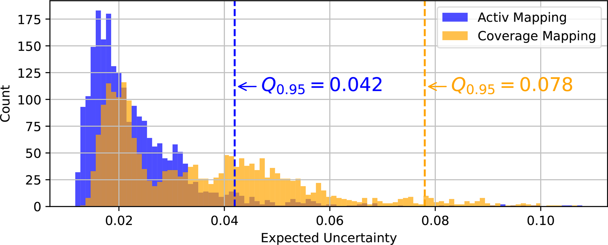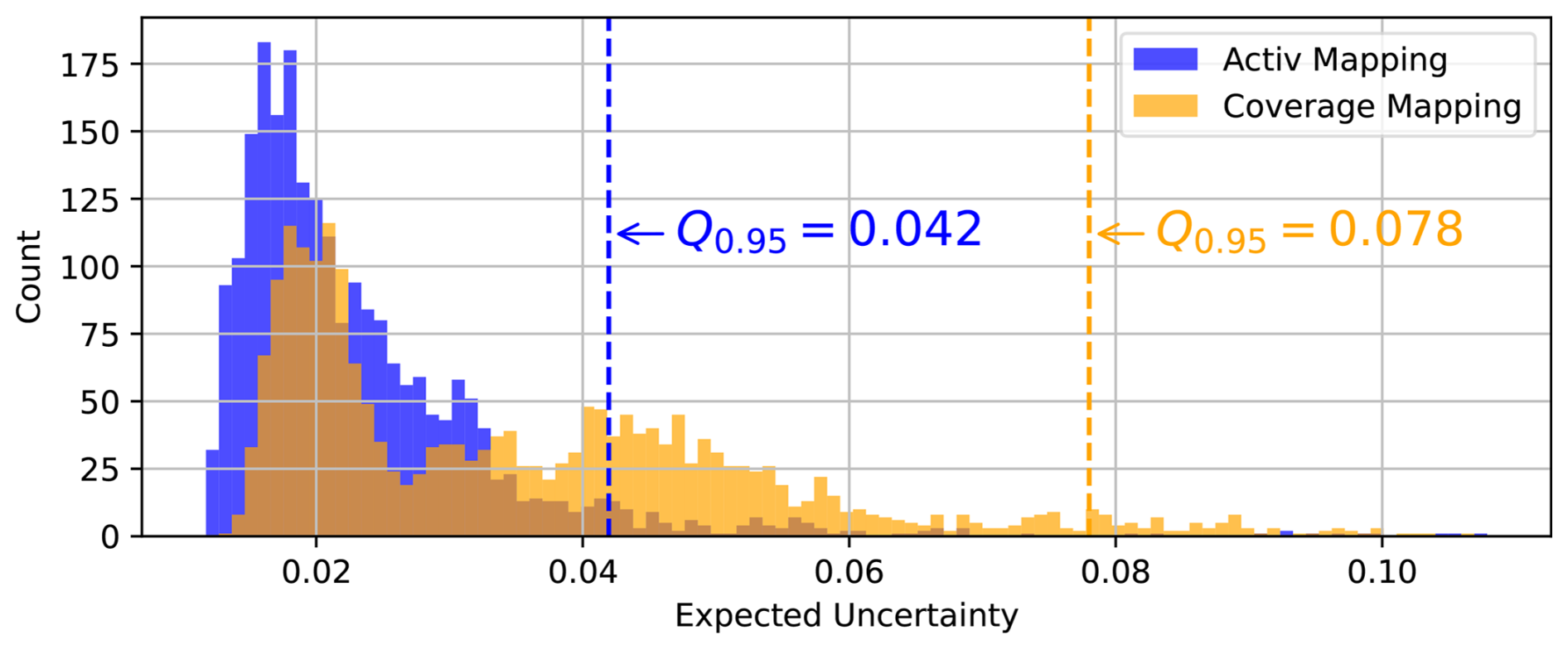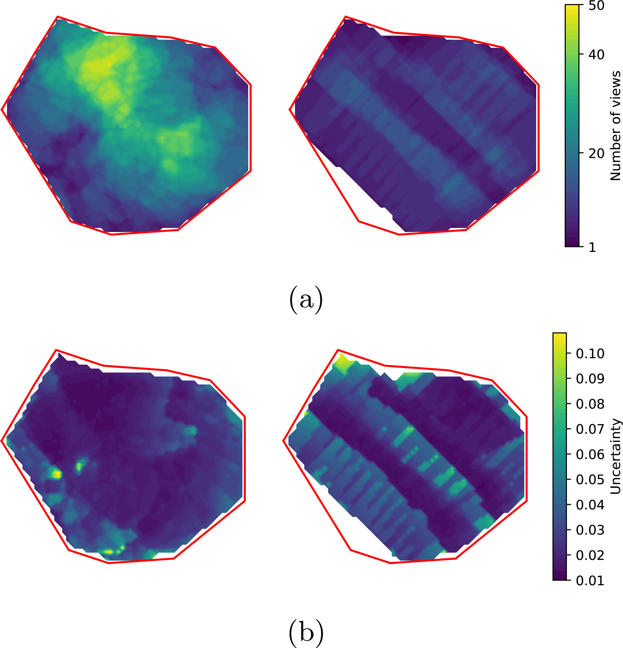 We look at two metrics prior to the reconstruction to evaluate the active mapping approach. The first is coverage, in which we consider as the portions of cells in the elevation map that was observed from more than two viewpoints. This is because two viewpoints are necessary conditions in which a reconstruction can be created at that position. The second metric is the fisher-information-based average expected uncertainty (Lim et al., 2023b), which quantifies the epistemic uncertainty expected from the photogrammetric reconstruction.