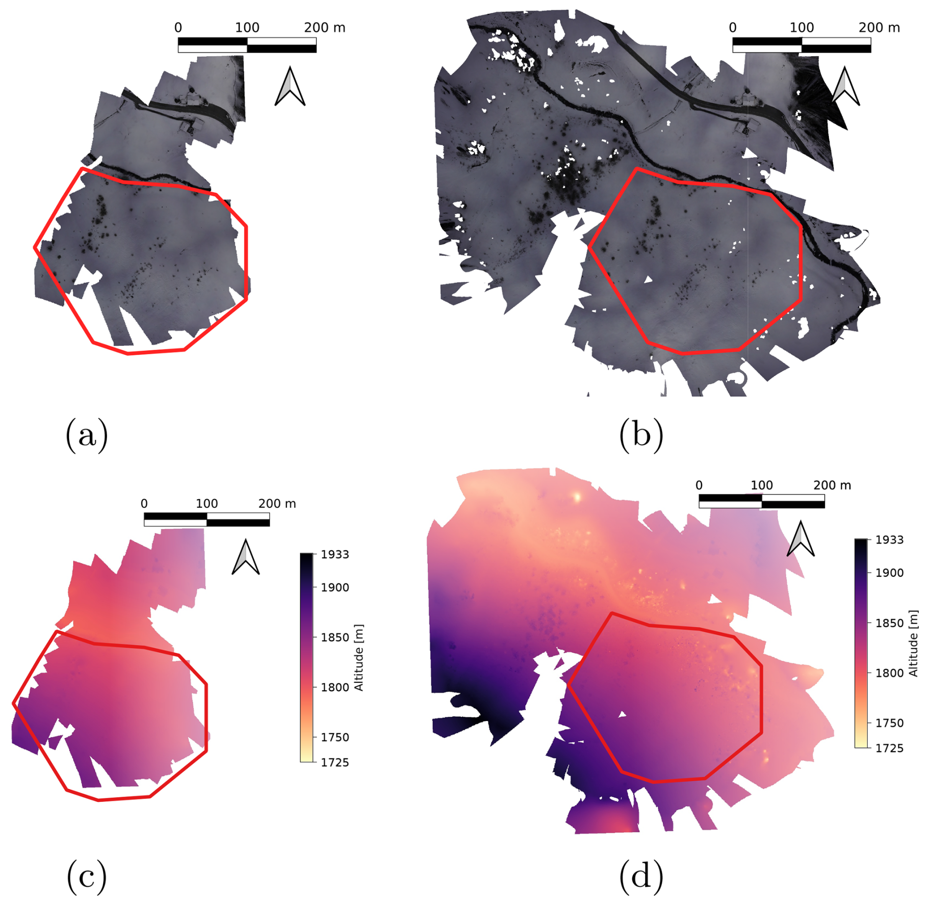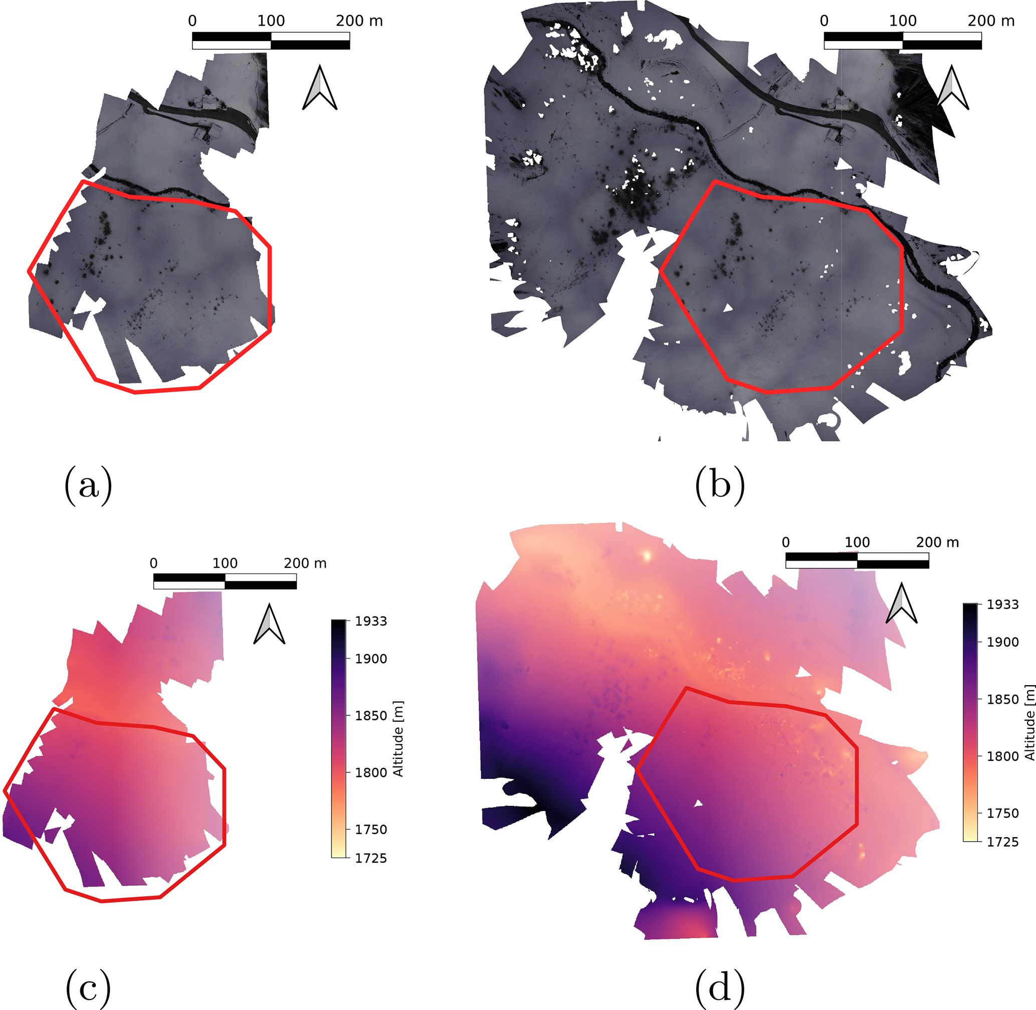 The experiments were conducted on the 25 April 2024, in the Flüela Valley in Davos, Switzerland. The ROI was defined around an avalanche deposit, where the extent of the ROI was outlined by hand where the the avalanche was observed. The ROI, however, only contained part of the avalanche due to operational constraints, such as visibility of the safety pilot. The weather was sunny, and the observed wind speeds were on average 2.8 m s−1 with a maximum of 3.6 m s−1. The snow had relatively little texture as there was fresh snow from a snowfall event the day prior to the field test.