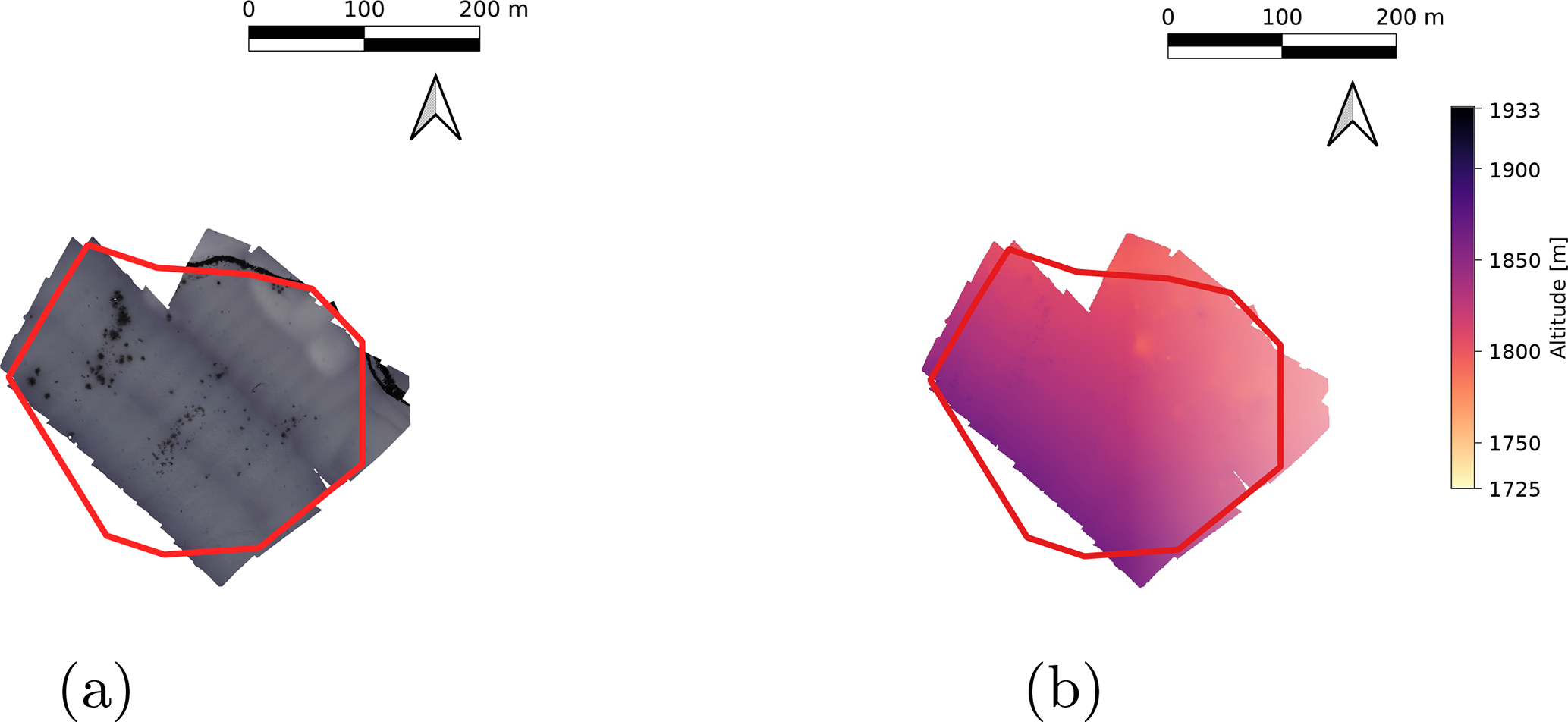 Figure 19Qualitative comparison of (a) orthomosaic and (b) elevation reconstruction with data acquired by coverage mapping (47 images). The red polygon represents the ROI.