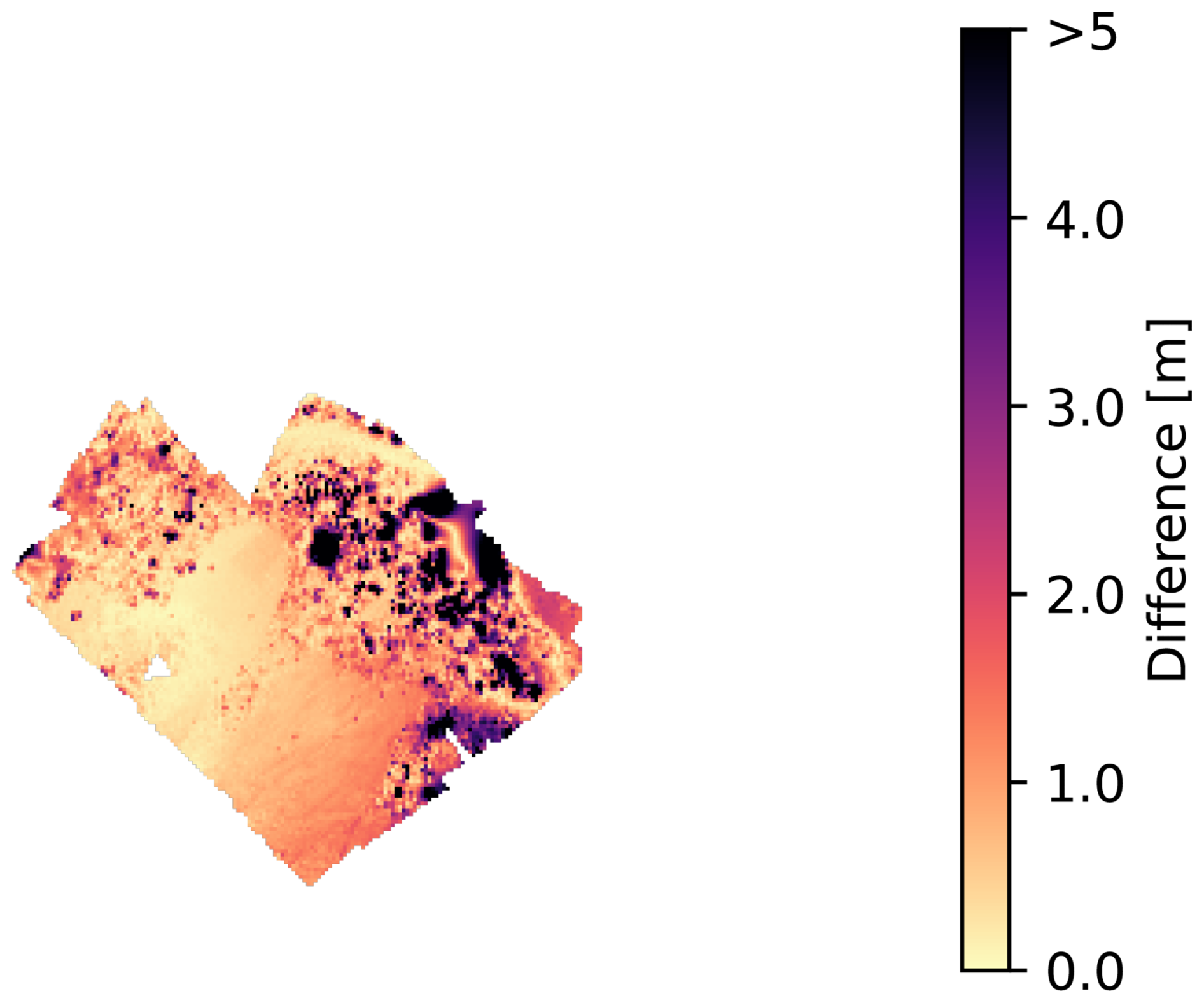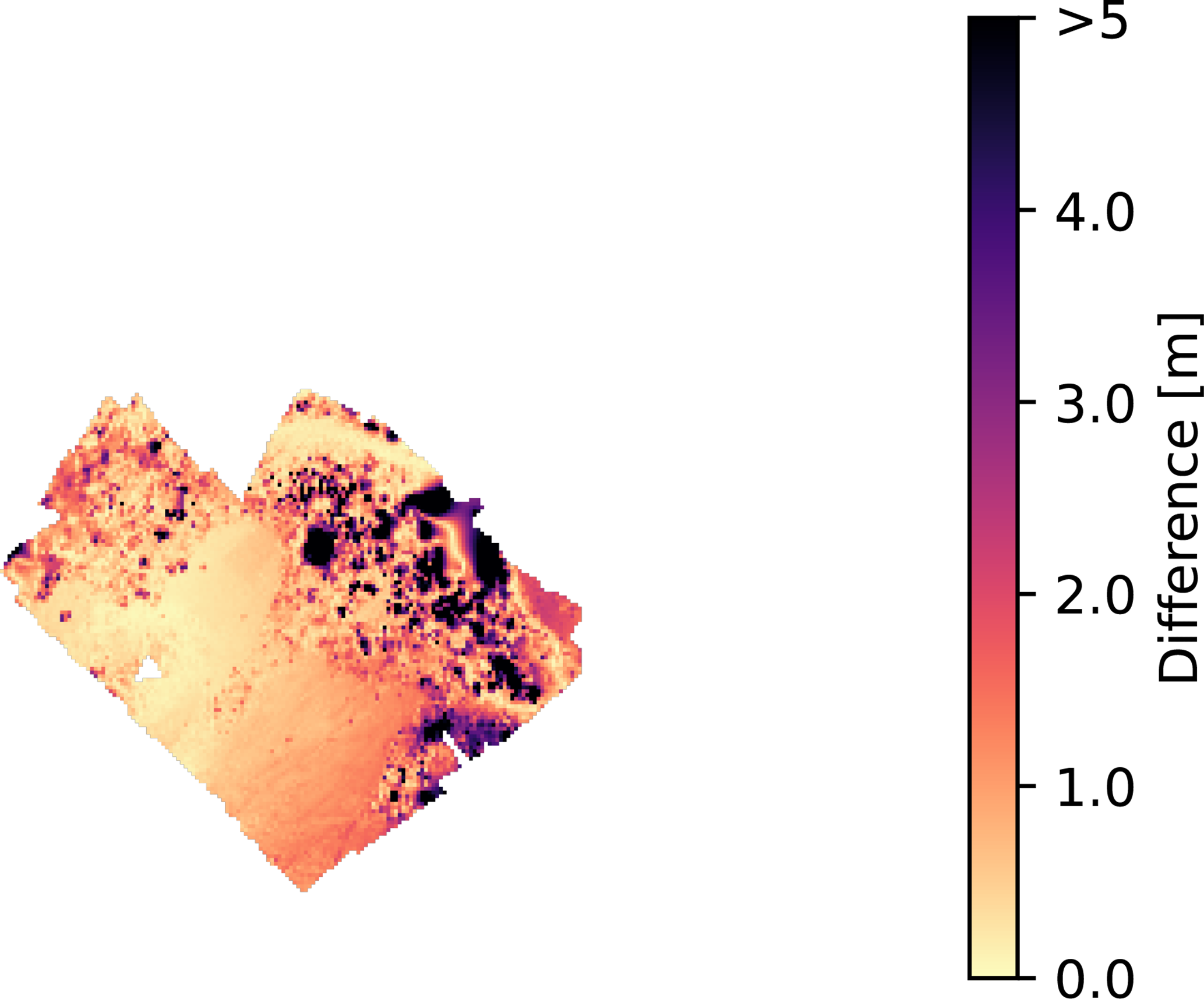 By comparing the difference between two elevation maps, we can see how consistent the reconstruction is (Fig. 20. The root mean squared error of the two maps is 2.71 m. Note that qualitatively the error does not match how the expected uncertainty is distributed in Fig. 16b. This is because the proposed approach does not consider appearance or texture of the surface, which can have a large impact on the quality of reconstruction. More discussion regarding this problem can be found in Sect. 5.1.