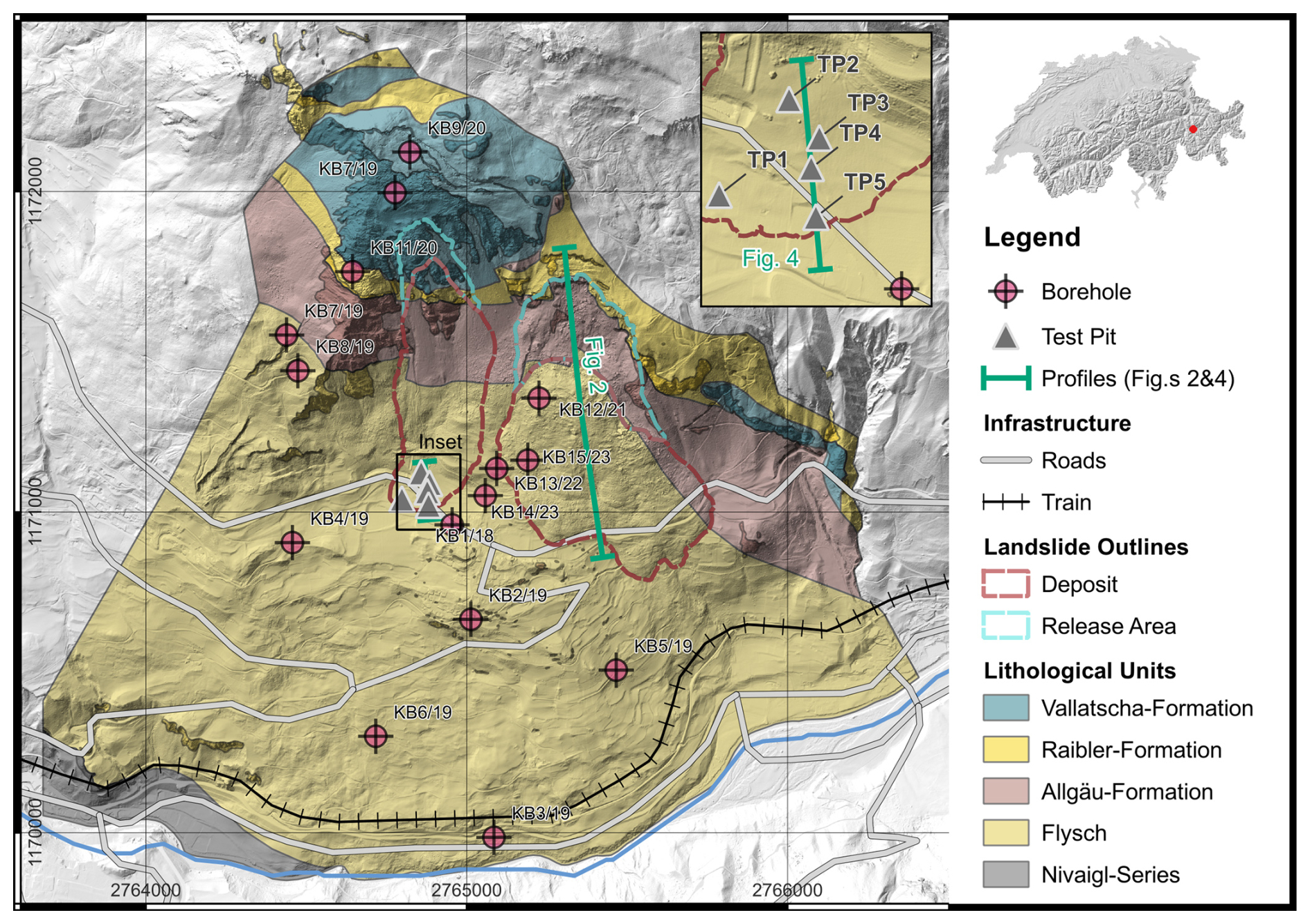 Figure 1Site overview, showing major geological units, the outlines of the two flowlike landslides, and borehole locations, (modified after BTG, 2022; hillshade © swisstopo).). The inset shows the section line used in Fig. 4.