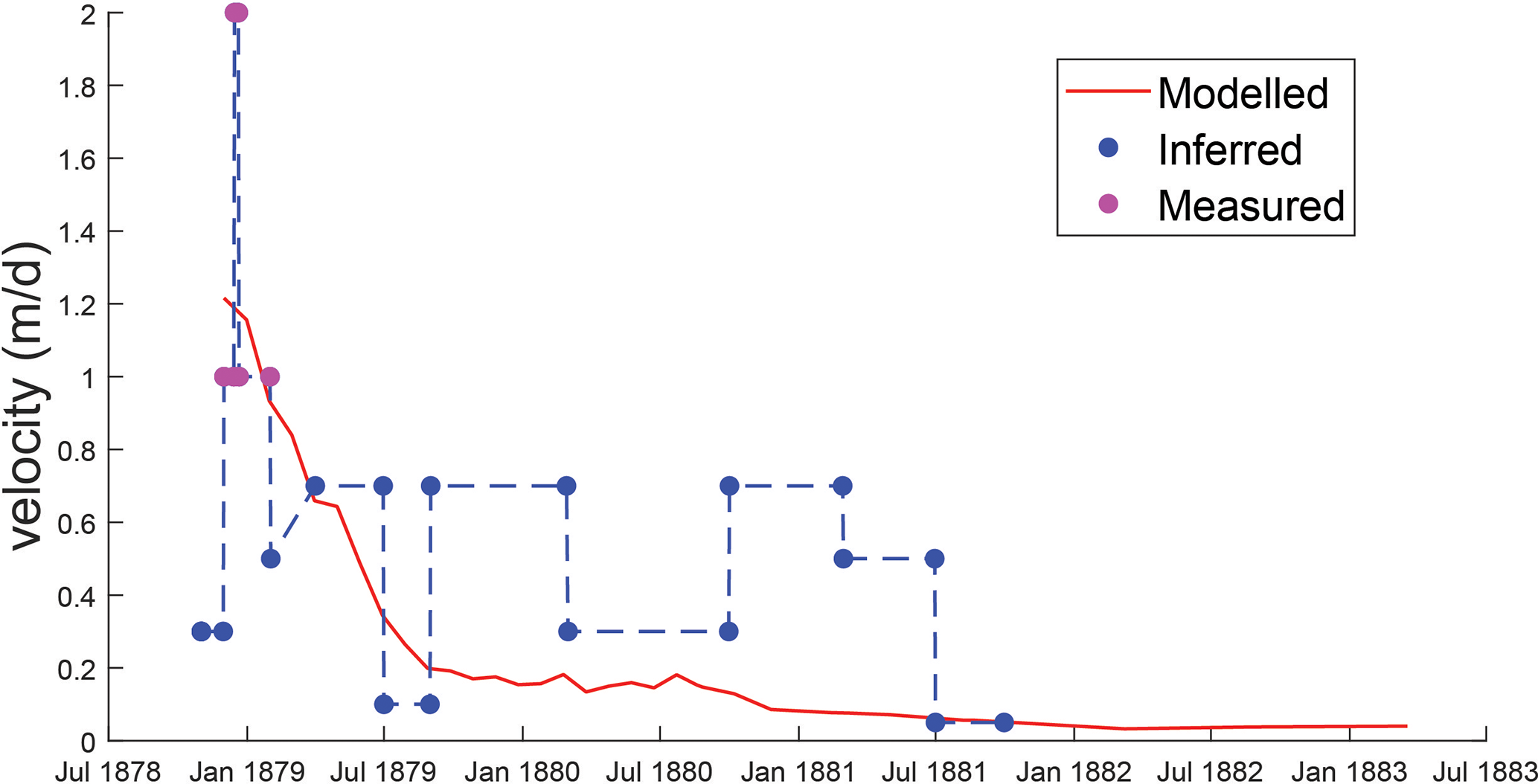 The emplacement of the Igl Rutsch landslide was documented by the Swiss geologist Albert Heim, in a report which describes the nearly 3 year emplacement process (Heim, 1881). In his report, he compares the emplacement of the Igl Rutsch landslide to the movement of a glacier, both because of the internal deformation structures that developed during emplacement, as well as the slow, flowlike movement. Albert Heim's account includes some quantitative and qualitative indications of the landslide velocity, which we interpret and summarize on Fig. 3. Heim (1881) describes the landslide as moving by 1 to 2 m d−1 in the winter of 1878. Following this, velocities are described more qualitatively, but clearly indicate that the landslide has slowed down on average, while continuing a long-term displacement trend with seasonal cycles (interpreted here as fluctuations between ∼ 0.125 and 0.75 m d−1, albeit with significant uncertainty). Finally, Heim (1881) states that by the summer of 1881 the movement rate had become imperceptible. Heim (1881) suggested that the landslide would continue to periodically move, potentially reaching the Albula river in a few hundred years. However, the landslide has remained relatively stable for the nearly 150 years since movement ceased, with modern velocities on the order of a few centimetre per year.