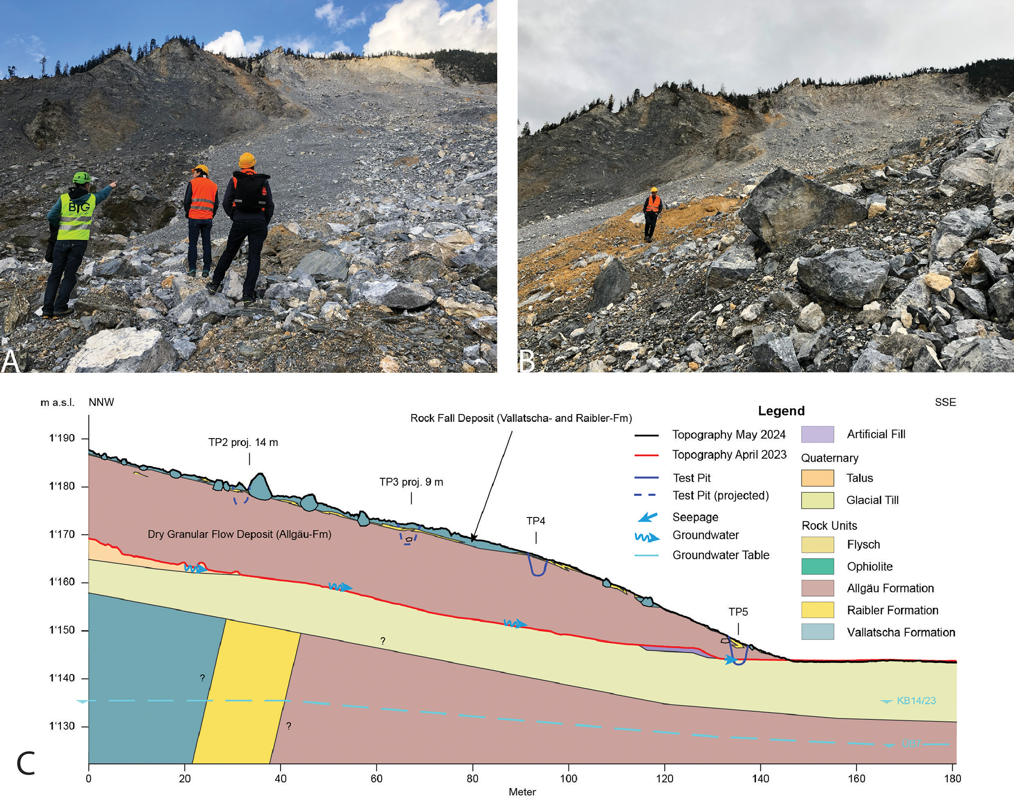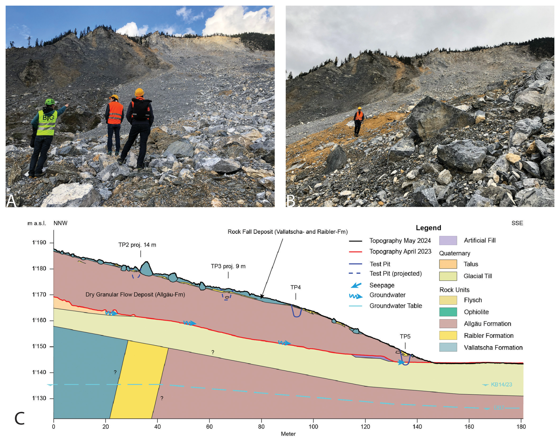 The Insel failure, which occurred on 15 June 2023, strongly contrasts the slow, viscous behaviour exhibited by the Igl Rutsch. Starting in 2022, the Insel compartment became distinct from its surroundings, and started to accelerate towards the village of Brienz/Brinzauls. The installed early warning system indicated that the compartment was heading towards a catastrophic failure, so in mid May, 2023 the village was evacuated (Loew et al., 2024). The compartment then failed during a short period on the evening of 15 June 2023, and reached extremely-rapid velocities which were 5 orders of magnitude greater than Igl Rutsch. Images of the deposit are shown on Fig. 4A and B, and test pits through the toe of the deposit are primarily composed of colluvium derived from the Allgäu formation, with a thin mantling of blocks of Vallatscha (Fig. 4C). The debris further upslope and in the source zone is primarily composed of colluvium derived from the Vallatscha formation (Loew et al., 2024).