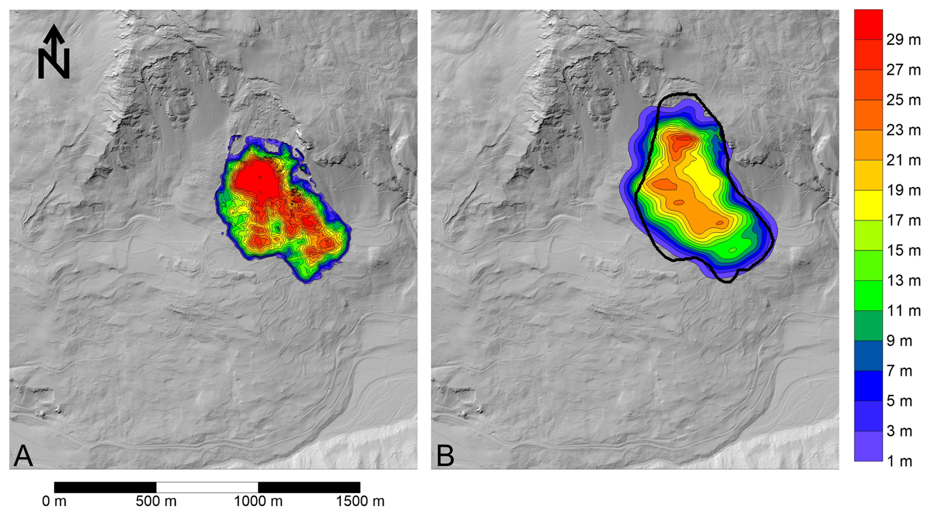 Figure 6(A) Estimated deposit thicknesses based on field evidence. (B) Best fit simulation results, with the black line showing the impact area estimated from the post-event hillshade. Elevation data used to generate hillshade: © swisstopo.