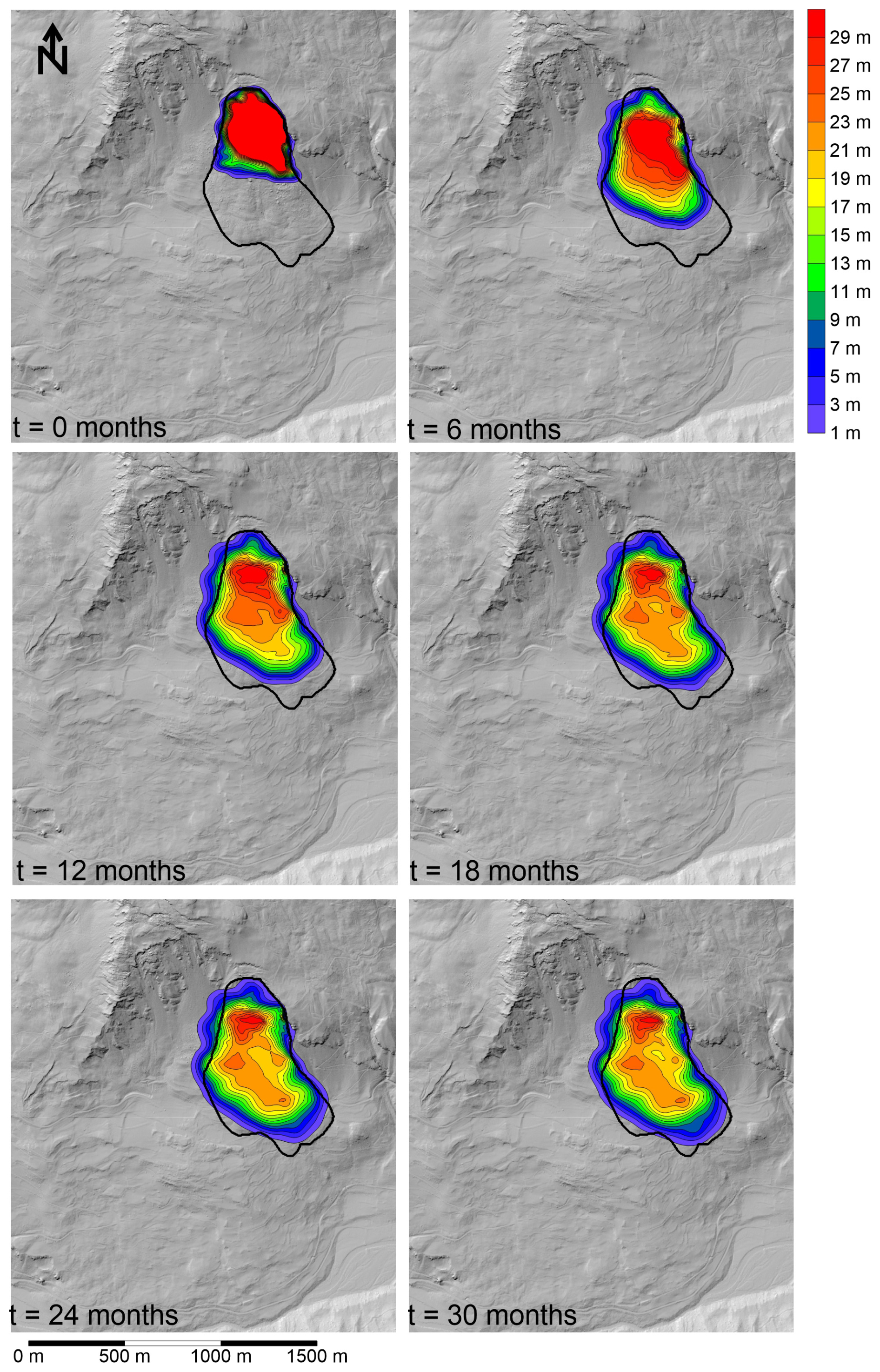 Timelapse deposit depths taken every 6 months (Fig. 7) shows that the mass spreads quickly during the first year, before reaching a steady state velocity, and finally coming to rest after about 3 years. This is also shown on the simulated velocities (Fig. 3), which compare well with those inferred from eye witness accounts in terms of the trend and the absolute values. Our simulations have initially high velocity values, on the order of 1 m d−1, which well matches those reported by Heim (1881). They then slow down, again in accordance with the previously cited account, before movement reaches levels of a few centimetre per day, and eventually ceasing altogether.