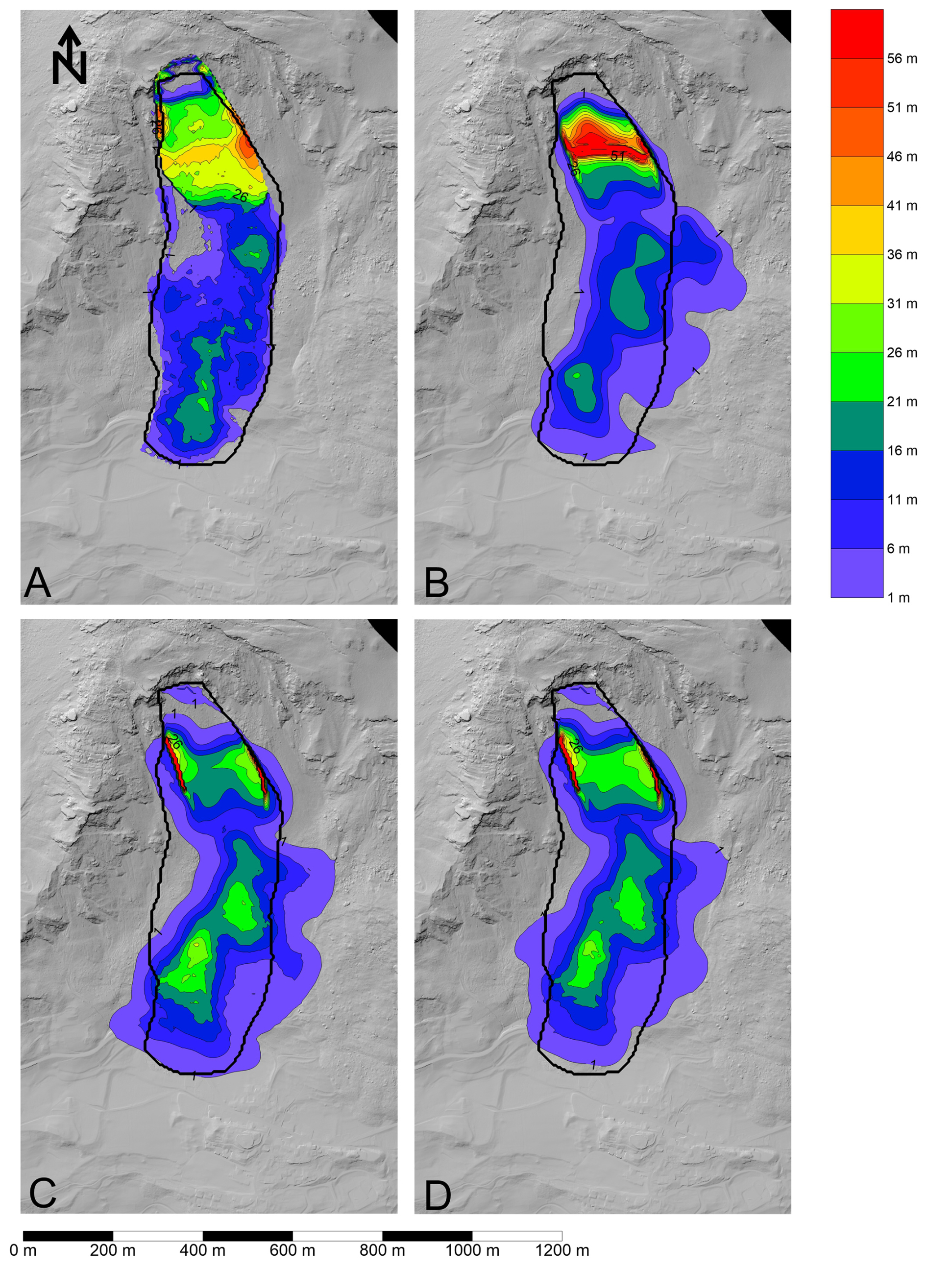 Figure 8Final deposit distribution simulated for the various simulation scenarios. (A) Deposit distribution estimated from the field evidence, (B) Two stage frictional, (C) One stage frictional, (D) One stage Voellmy. The thick deposits on the margins of the source zone are an artefact of the interpolation algorithm used in the numerical model. Elevation data used to generate hillshade: © swisstopo.