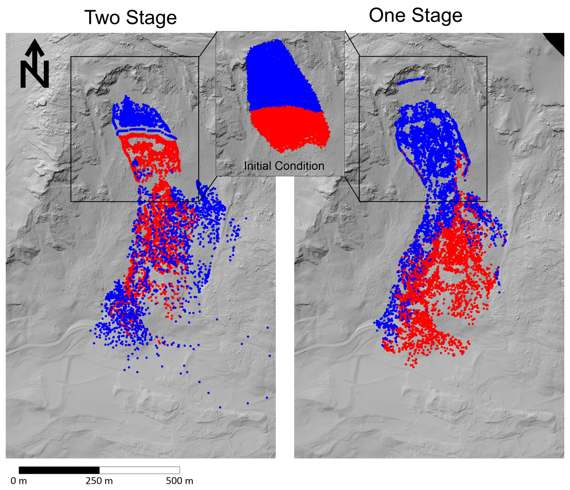 Figure 9Comparison of lithology distribution for the two-stage and one-stage simulations. Red: mainly Allgäu Schist and to a minor extent Raibler Rauwacke, Blue: Vallatscha Dolomite. The inset shows the pre-failure distribution of the two main lithologies at the source zone at t=0. Elevation data used to generate hillshade: © swisstopo.