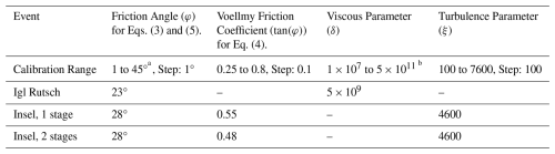 We back-analysed the Igl Rutsch and Insel case histories in order to derive model parameters that can be used for forecasting events that have similar types. For Igl Rutsch, we used the new semi-implicit runout model (Eqs. 7 and 8), as well as the failure geometry shown on Fig. 2. We used timesteps of 720 s, 4000 particles, a topographic resolution of 10 m, and performed a probabilistic calibration (described below) in order to calibrate the friction angle and viscous parameter (Eq. 5). We used a numerical resolution of 4000 particles as the results are relatively insensitive to this choice (Aaron, 2023), and it keeps model runtimes low. As part of this calibration, we compared measured and simulated velocities for the event (Fig. 3). The latter velocities were obtained by calculating the velocity of the simulated front as it moves over the slope, as this provides the closest simulated quantity to the velocities estimated from eye witness accounts.