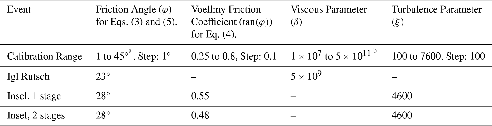 The main goal of the back-analyses performed in the present work is to derive basal resistance parameters that can be interpreted to infer flow mechanics. It is therefore important that uncertainties in the calibrated parameters are quantified, such that they can be considered in forecasts. To do this, we used the calibration methodology that is detailed in Aaron et al. (2019), which can be used to estimate a posterior probability density function of the unknown bulk material parameters that govern the user-specified rheologies. Briefly, this methodology uses estimates of impact area, deposit distribution and velocity to calculate a model fitness number for a given input parameter set. We then run the model a large number of times on a regular grid of parameters, in order to calculate the fitness numbers for a discretization of the entire parameter space, and use these numbers and assumed standard deviations to calculate a posterior probability density function. The parameter ranges explored for the various rheologies are given in Table 1.