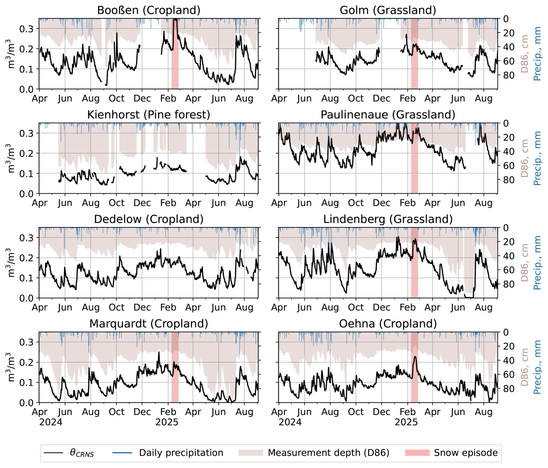 Figure 2Observed (black) soil water dynamics at the monitoring locations, as well as CRNS measurement depth (D86, i.e. the depth that accounts for 86 % of the signal) and daily precipitation depths. Extended snow episodes are marked by the red shade. During these times, the CRNS signal should not be interpreted in terms of soil moisture.