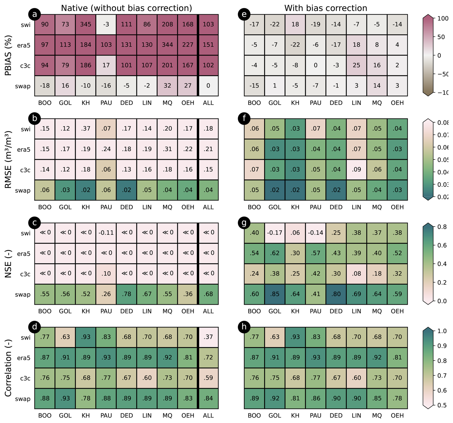 For the native products (i.e. without bias correction or calibration), all large-scale products (SWI, ERA5-Land, C3C) suffer from very high levels of systematic bias (Fig. 3a) which directly propagates to RMSE and NSE (Fig. 3b and c). The local hydrological model SWAP is much less biased (highest levels for locations MQ and QEH). For RMSE and NSE, SWAP also outperforms all competitors at all locations. For correlation (Fig. 3e), ERA5-Land and SWAP perform similarly, with ERA5-Land even slightly outperforming SWAP in three out of eight locations. Together with its strong bias, the high correlation found for ERA5-Land gives rise to the expectation that this product could particularly benefit from a bias correction (see below). In terms of correlation at the individual locations, SWI and C3C are quite similar, with an intermediate performance.