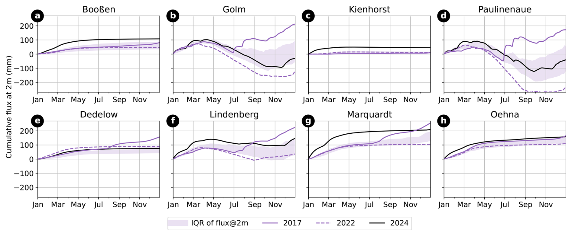 • For the locations that started before or in April 2024, the records demonstrate clear differences between 2024 and 2025 with regard to spring and early summer. This period, specifically May and June, is critical with regard to the impact of drought on crops (see Brill et al.2024, for a Brandenburg-specific analysis). While 2024 featured some pronounced drying from mid April to mid May, the following months were characterized by repeated and substantial rainfall, only followed by a dry spell in August 2024. In 2025, however, remarkable drying already started in March and led to a prolonged drought period in May and June (most prominent in Booßen, Lindenberg, and Marquardt), interrupted by a wet July, and followed by another remarkable dry-up in August.