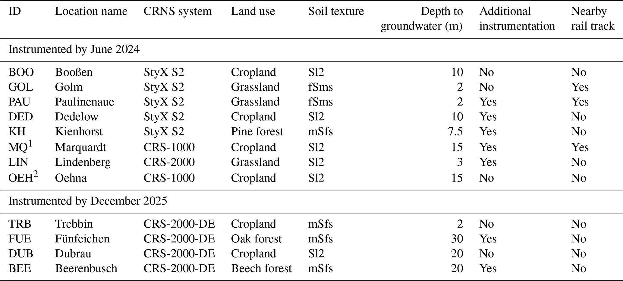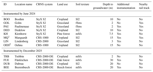 Table 1Overview of CRNS-based monitoring locations. The CRNS systems “StyX S2” were manufactured by StyX Neutronica GmbH (Mannheim, Germany), “CRS-1000” and “CRS-2000” by Hydroinnova LLC (Albuquerque, USA); the “CRS-2000-DE” is a special design by Hydroinnova that features 3He as detector gas and has a higher sensitivity than the widely used CRS-2000-B. Soil texture classes were obtained from BUEK300 (LBGR2024): Sl2 (loamy sand), fSms (fine sand), mSfs (medium sand); depth to the groundwater table was obtained from LfU (2013). “Additional instrumentation” indicates the availability of hydrometeorological or hydrological monitoring by the site owners (such as eddy flux towers, lysimeter, groundwater observation wells) in addition to the CRNS station itself.