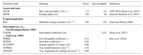 Table 2Overview of key SWAP model parameters related to vegetation and corresponding references. The bold labels explain the vegetation-related compartments or processes to which the parameters refer, namely properties of “Leaves and roots”, parameters related to “Evapotranspiration” and to “Interception” where the parameters under Von Hoyningen-Huene (1983) relate to grassland and cropland while the parameters under Gash et al. (1995) relate to pine forest. Please refer to Kroes et al. (2017) for further details on the corresponding parameters.