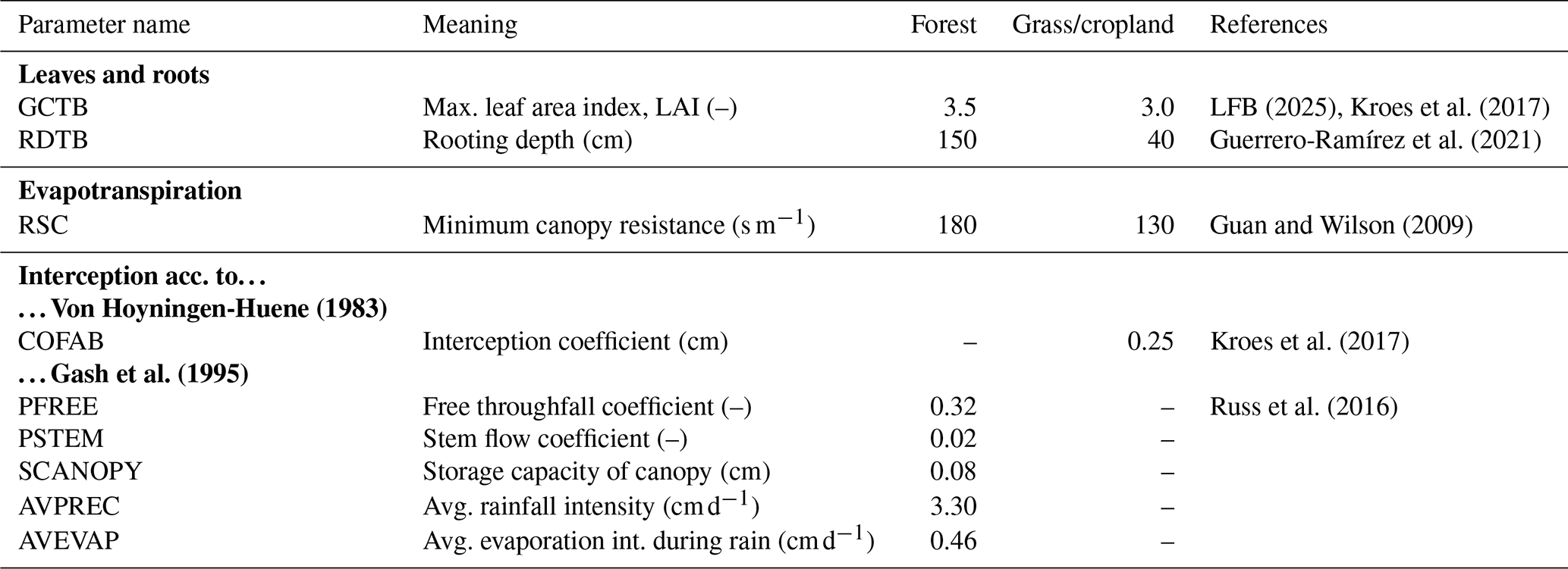 Von Hoyningen-Huene, J.: Die Interzeption des Niederschlags in landwirtschaftlichen Pflanzenbeständen, in: Einfluß der Landnutzung auf den Gebietswasserhaushalt, DVWK-Schriften 57, Deutscher Verband für Wasserwirtschaft und Kulturbau, Verlag Paul Parey, 54 pp., https://wiki.bluemodel.org/images/9/9e/DVWK_57_I.pdf (last access: 19 January 2026), 1983. a, b