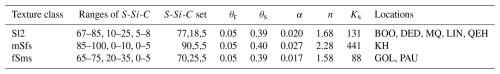 Table 3Ranges of sand (S), silt (Si) and clay (C) for the three major soil texture classes in Brandenburg (Sl2, mSfs, and fSms) as obtained from LBGR (2024) and BGR (2005); resulting S-Si-C combinations used for the uncalibrated model, as well as the resulting sets of SHP parameters; corresponding monitoring locations.